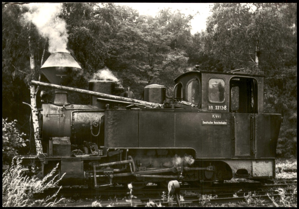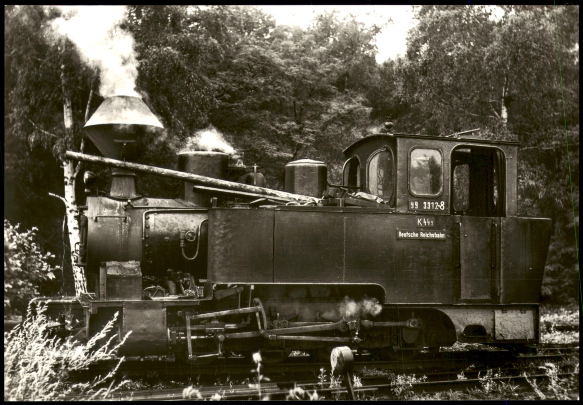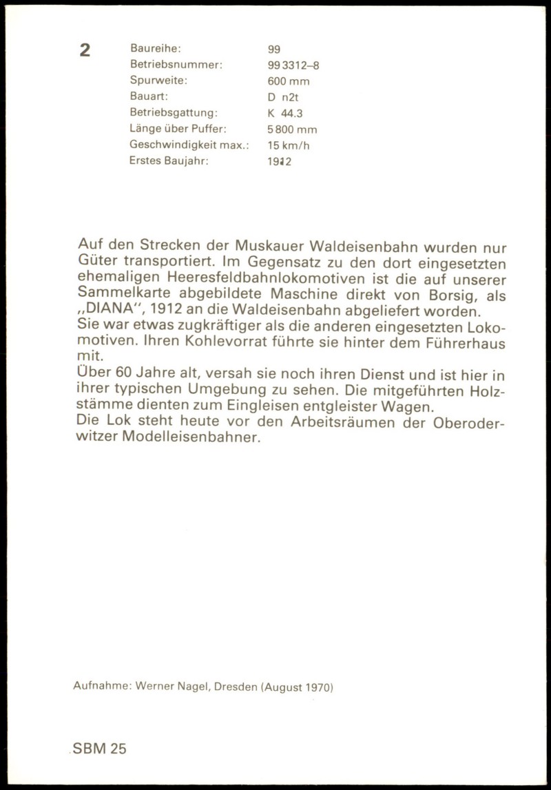 - Baureihe: Betriebsnummer: Spurweite: Bauart: Betriebsgattung: Länge über Puffer: Geschwindigkeit max.: Erstes Baujahr: 99 99 3312-8 600 mm D n2t K 44.3 5800 mm 15 km/h 1912 99 3312-8 K443 Deutsche Reichsbahn Auf den Strecken der Muskauer Waldeisenbahn wurden nur Güter transportiert. Im Gegensatz zu den dort eingesetzten ehemaligen Heeresfeldbahnlokomotiven ist die auf unserer Sammelkarte abgebildete Maschine direkt von Borsig, als ,,DIANA", 1912 an die Waldeisenbahn abgeliefert worden. Sie war etwas zugkräftiger als die anderen eingesetzten Loko- motiven. Ihren Kohlevorrat führte sie hinter dem Führerhaus mit. Über 60 Jahre alt, versah sie noch ihren Dienst und ist hier in ihrer typischen Umgebung zu sehen. Die mitgeführten Holz- stämme dienten zum Eingleisen entgleister Wagen. Die Lok steht heute vor den Arbeitsräumen der Oberoder- witzer Modelleisenbahner. Aufnahme: Werner Nagel, Dresden (August 1970) SBM 25