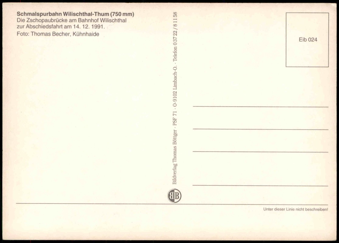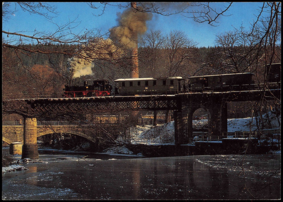Foto Karte: Schmalspurbahn Wilischthal-Thum auf der Zschopaubrücke am Bahnhof Wilischthal