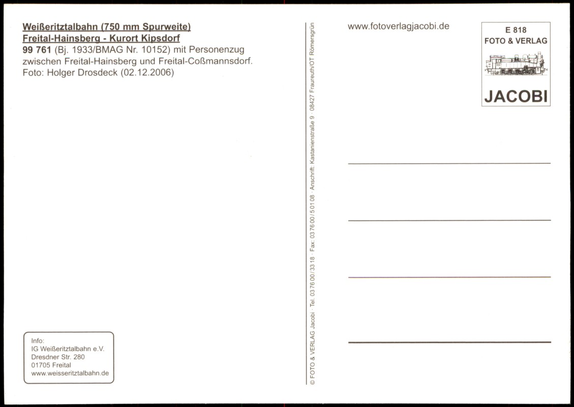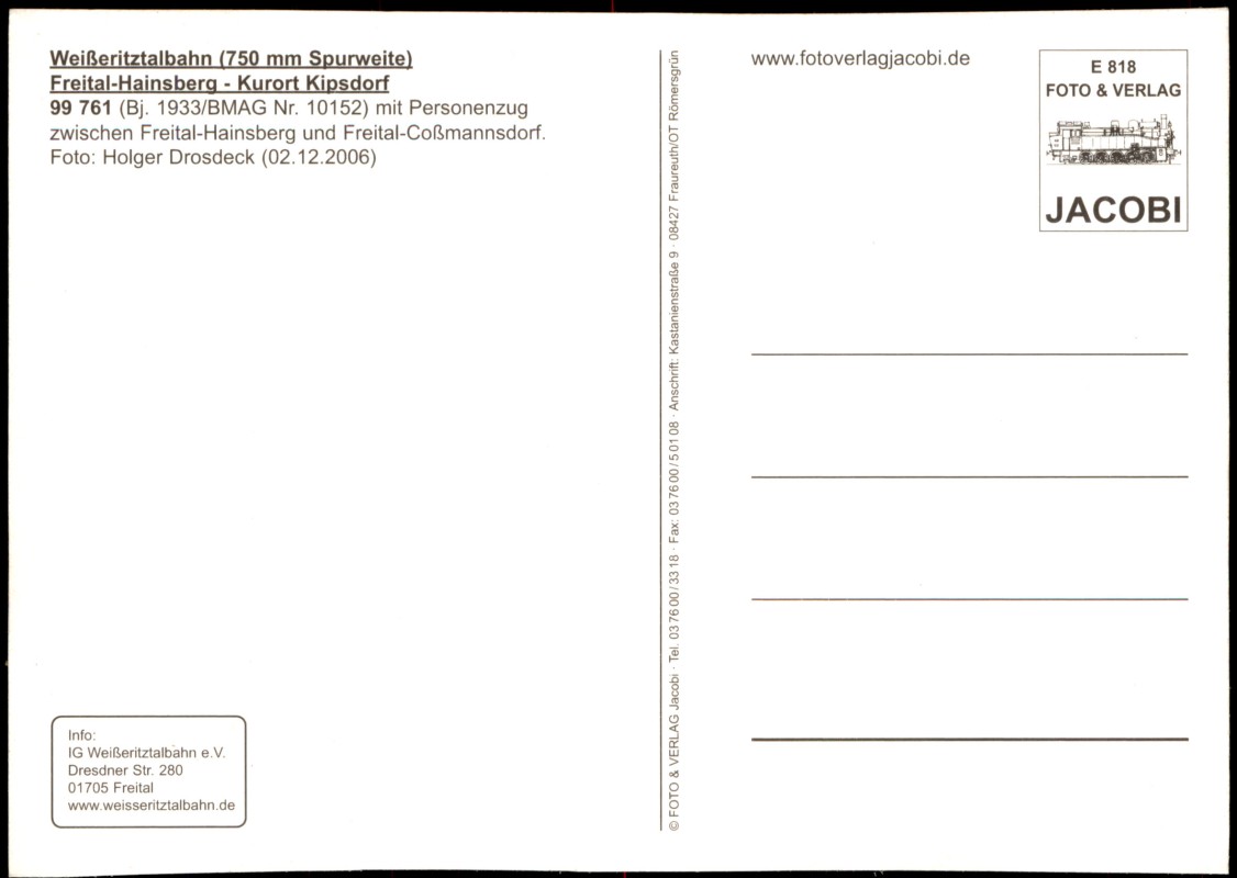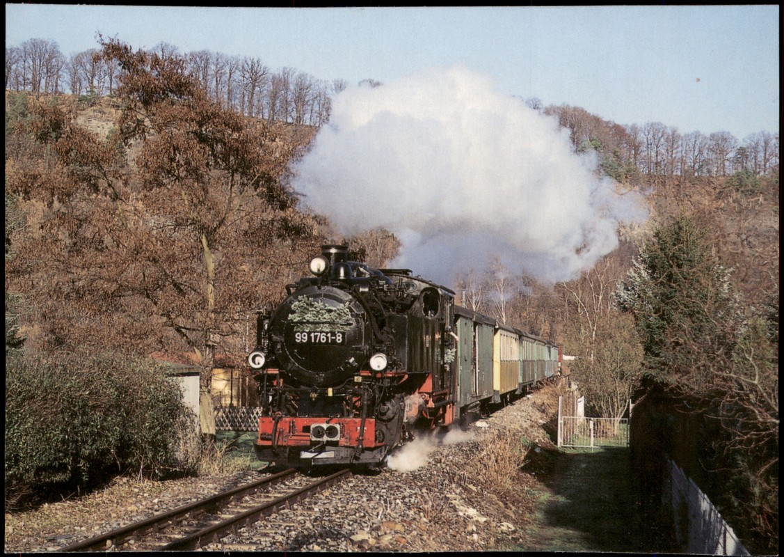 - Postkarte der Weißeritztalbahn (750 mm Spurweite) mit der 99 761 (Bj. 1933/BMAG Nr. 10152) mit Personenzug zwischen Freital-Hainsberg und Freital-Coßmannsdorf.