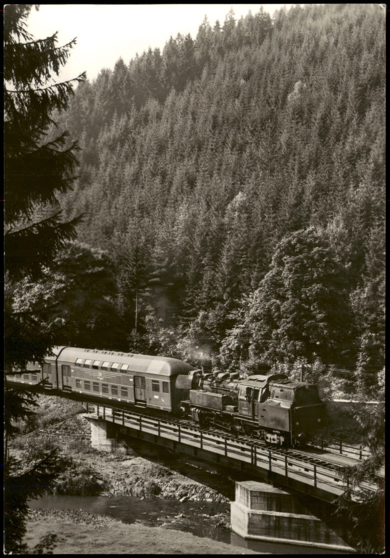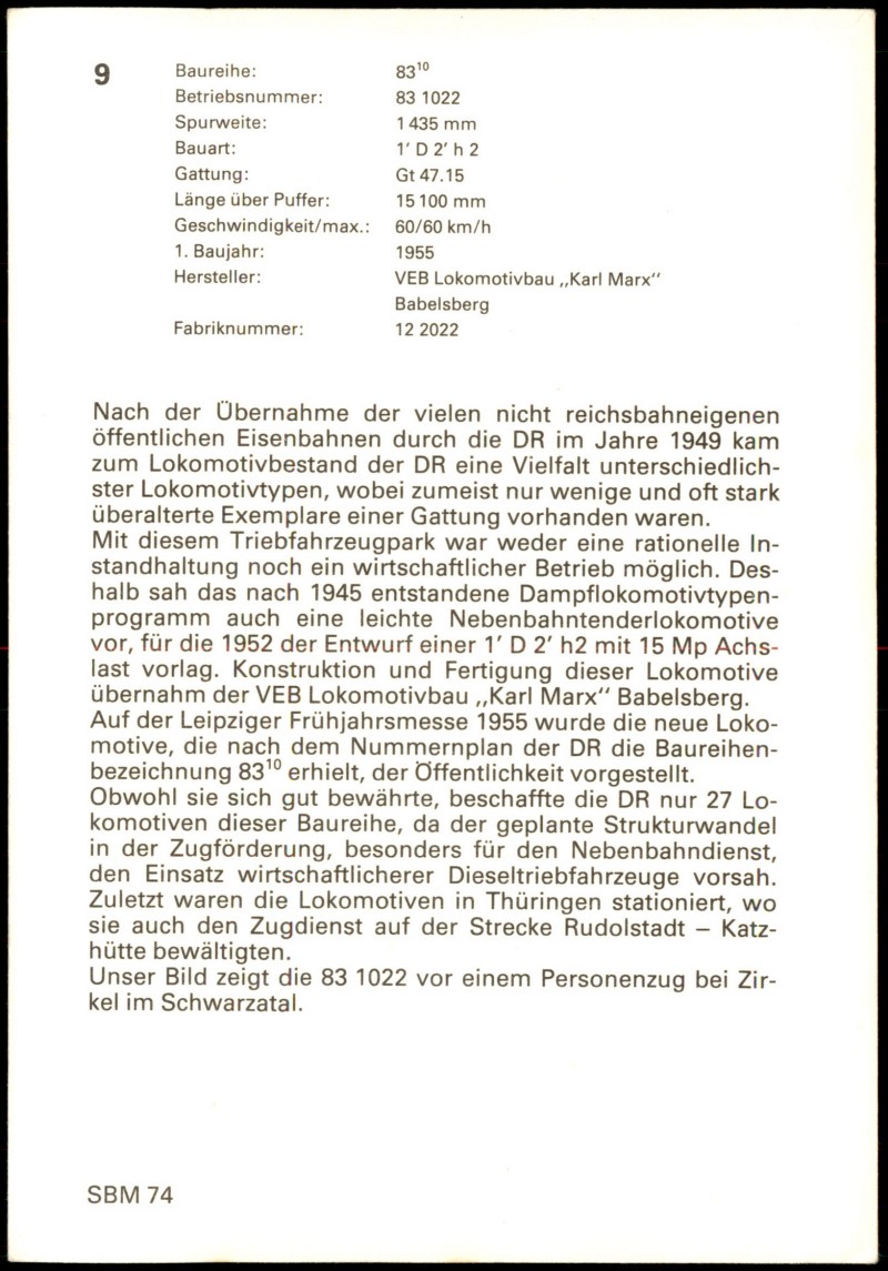 - Die Postkarte zeigt die Dampflokomotive 83 1022 der Baureihe 83 vor einem Personenzug bei Zirkel im Schwarzatal. Die Lokomotive wurde 1955 vom VEB Lokomotivbau „Karl Marx“ Babelsberg gebaut und auf der Leipziger Frühjahrsmesse 1955 vorgestellt. Die Baureihe 83 wurde für den Nebenbahndienst entwickelt und war zuletzt in Thüringen stationiert, wo sie auch den Zugdienst auf der Strecke Rudolstadt - Katzhütte bewältigte.