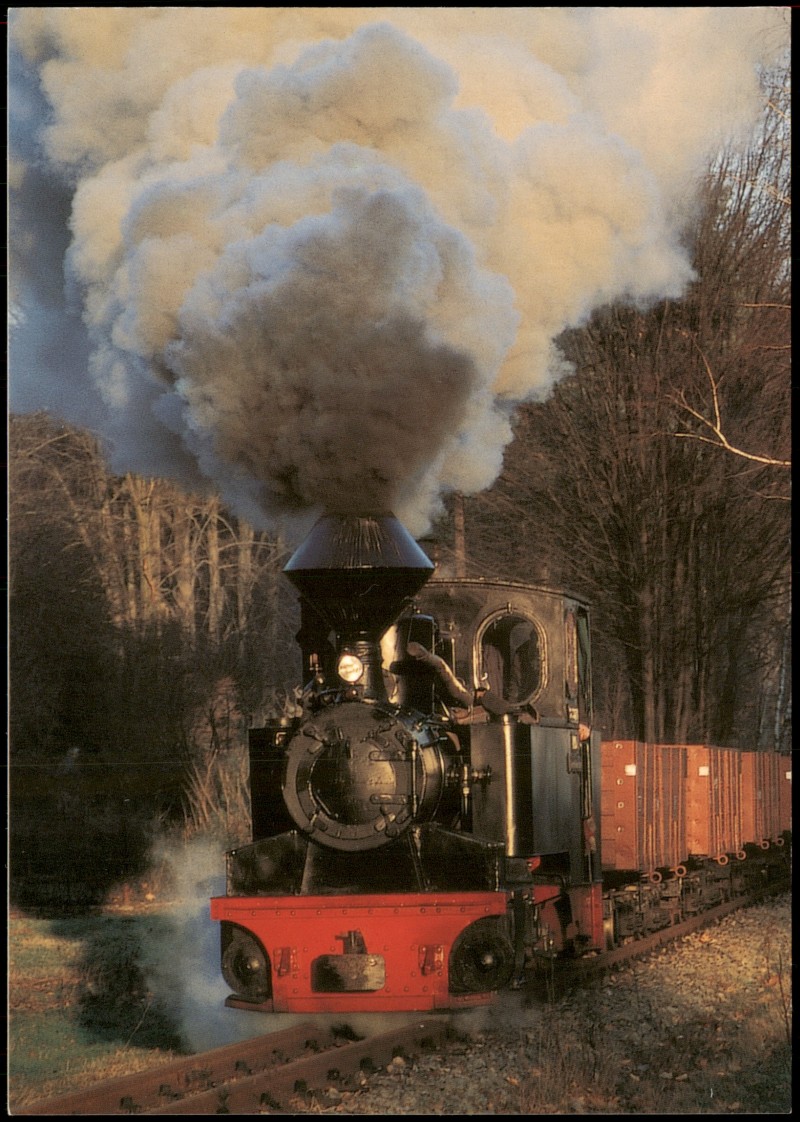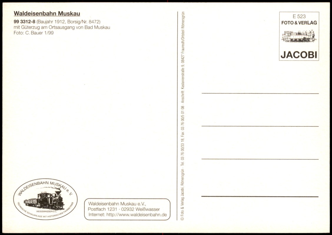 - Ansicht der Waldeisenbahn Muskau mit der Lokomotive 99 3312-8 (Baujahr 1912, Borsig/Nr. 8472) und einem Güterzug am Ortsausgang von Bad Muskau. Das Foto wurde von C. Bauer im Januar 1999 aufgenommen. Die Karte wurde von Foto & Verlag Jacobi aus Römersgrün herausgegeben, mit der Seriennummer E 523. Die Waldeisenbahn Muskau e.V. wird als technische Schmalspuranlage mit historischem Fahrbetrieb beschrieben.