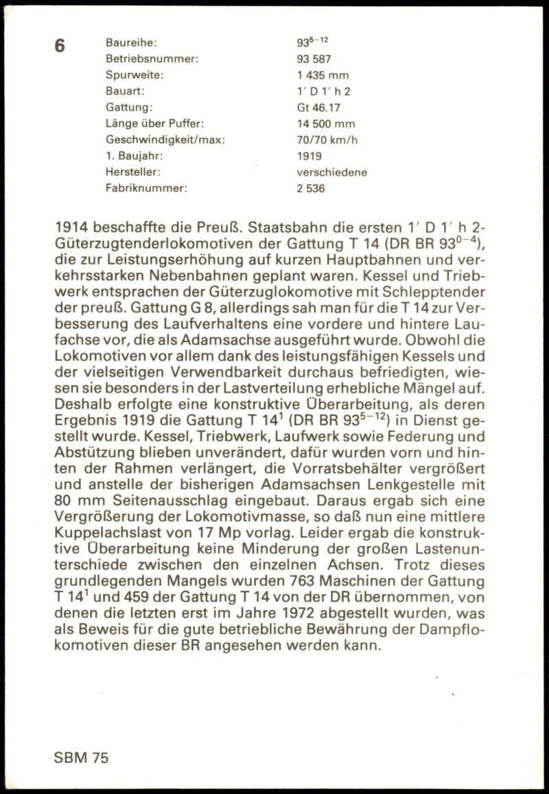 - 1914 beschaffte die Preuß. Staatsbahn die ersten 1' D 1' h 2-Güterzugtenderlokomotiven der Gattung T 14 (DR BR 930-4),die zur Leistungserhöhung auf kurzen Hauptbahnen und ver-kehrsstarken Nebenbahnen geplant waren. Kessel und Trieb-werk entsprachen der Güterzuglokomotive mit Schlepptenderder preuß. Gattung G 8, allerdings sah man für die T 14 zur Ver-besserung des Laufverhaltens eine vordere und hintere Lauf-achse vor, die als Adamsachse ausgeführt wurde. Obwohl die Lokomotiven vor allem dank des leistungsfähigen Kessels undder vielseitigen Verwendbarkeit durchaus befriedigten, wie-sen sie besonders in der Lastverteilung erhebliche Mängel auf.Deshalb erfolgte eine konstruktive Überarbeitung, als deren Ergebnis 1919 die Gattung T 14' (DR BR 935-12) in Dienst ge-stellt wurde. Kessel, Triebwerk, Laufwerk sowie Federung und Abstützung blieben unverändert, dafür wurden vorn und hin-ten der Rahmen verlängert, die Vorratsbehälter vergrößertund anstelle der bisherigen Adamsachsen Lenkgestelle mit80 mm Seitenausschlag eingebaut. Daraus ergab sich eine Vergrößerung der Lokomotivmasse, so daß nun eine mittlere Kuppelachslast von 17 Mp vorlag. Leider ergab die konstruk-tive Überarbeitung keine Minderung der großen Lastenun-terschiede zwischen den einzelnen Achsen. Trotz diesesgrundlegenden Mangels wurden 763 Maschinen der Gattung T 14' und 459 der Gattung T 14 von der DR übernommen, vondenen die letzten erst im Jahre 1972 abgestellt wurden, wasals Beweis für die gute betriebliche Bewährung der Dampflo-komotiven dieser BR angesehen werden kann.