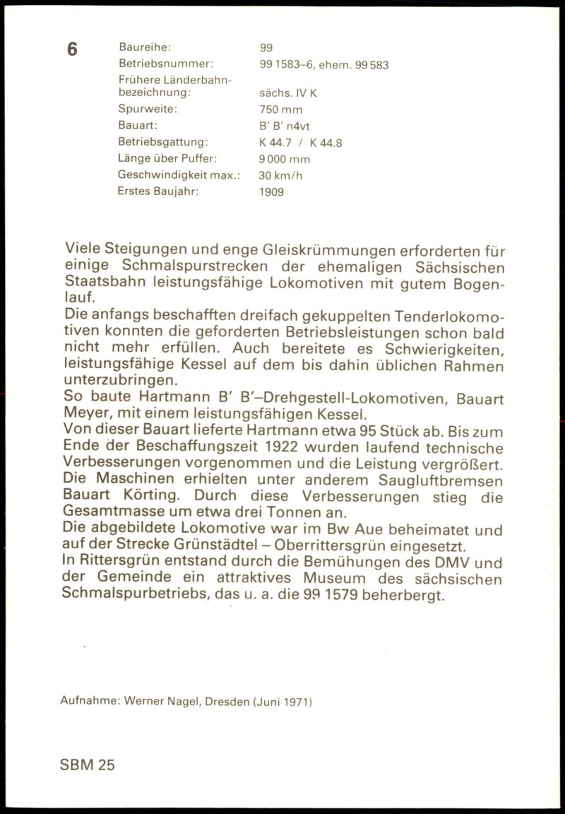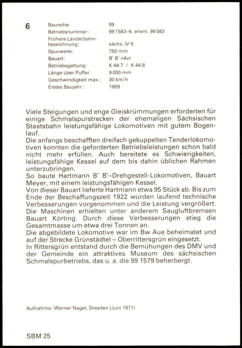 - Viele Steigungen und enge Gleiskrümmungen erforderten füreinige Schmalspurstrecken der ehemaligen Sächsischen Staatsbahn leistungsfähige Lokomotiven mit gutem Bogen-lauf. Die anfangs beschafften dreifach gekuppelten Tenderlokomo-tiven konnten die geforderten Betriebsleistungen schon baldnicht mehr erfüllen. Auch bereitete es Schwierigkeiten,leistungsfähige Kessel auf dem bis dahin üblichen Rahmenunterzubringen. So baute Hartmann B' B'-Drehgestell-Lokomotiven, Bauart Meyer, mit einem leistungsfähigen Kessel. Von dieser Bauart lieferte Hartmann etwa 95 Stück ab. Bis zum Ende der Beschaffungszeit 1922 wurden laufend technische Verbesserungen vorgenommen und die Leistung vergrößert.Die Maschinen erhielten unter anderem Saugluftbremsen Bauart Körting. Durch diese Verbesserungen stieg die Gesamtmasse um etwa drei Tonnen an. Die abgebildete Lokomotive war im Bw Aue beheimatet undauf der Strecke Grünstädtel - Oberrittersgrün eingesetzt.In Rittersgrün entstand durch die Bemühungen des DMV undder Gemeinde ein attraktives Museum des sächsischen Schmalspurbetriebs, das u. a. die 99 1579 beherbergt.