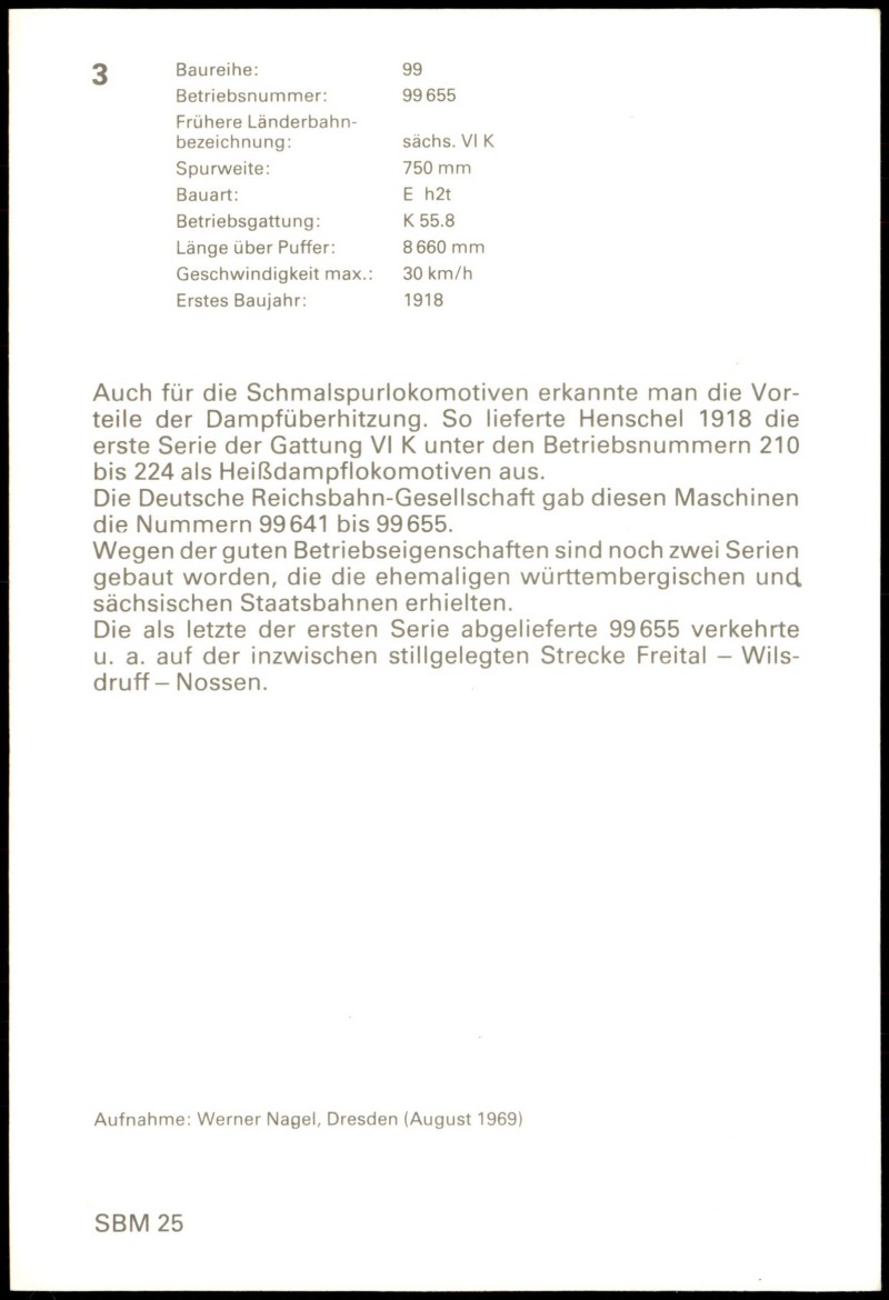 - Detaillierte Ansicht der Schmalspurlokomotive Baureihe 99, Betriebsnummer 99 655, der früheren Länderbahn-Bezeichnung sächs. VI K. Die Lokomotive hat eine Spurweite von 750 mm, Bauart E h2t und Betriebsgattung K 55.8. Ihre Länge über Puffer beträgt 8660 mm und die Höchstgeschwindigkeit 30 km/h. Das erste Baujahr war 1918. Die Gattung VI K wurde 1918 von Henschel als Heißdampflokomotiven ausgeliefert (Betriebsnummern 210 bis 224) und später von der Deutschen Reichsbahn-Gesellschaft als 99 641 bis 99 655 nummeriert. Die abgebildete 99 655 war die letzte der ersten Serie und verkehrte unter anderem auf der inzwischen stillgelegten Strecke Freital - Wilsdruff - Nossen. Die Aufnahme stammt von Werner Nagel, Dresden, aus dem August 1969. Verlag SBM, Seriennummer 25.