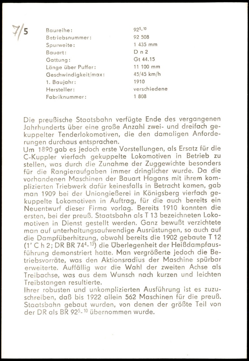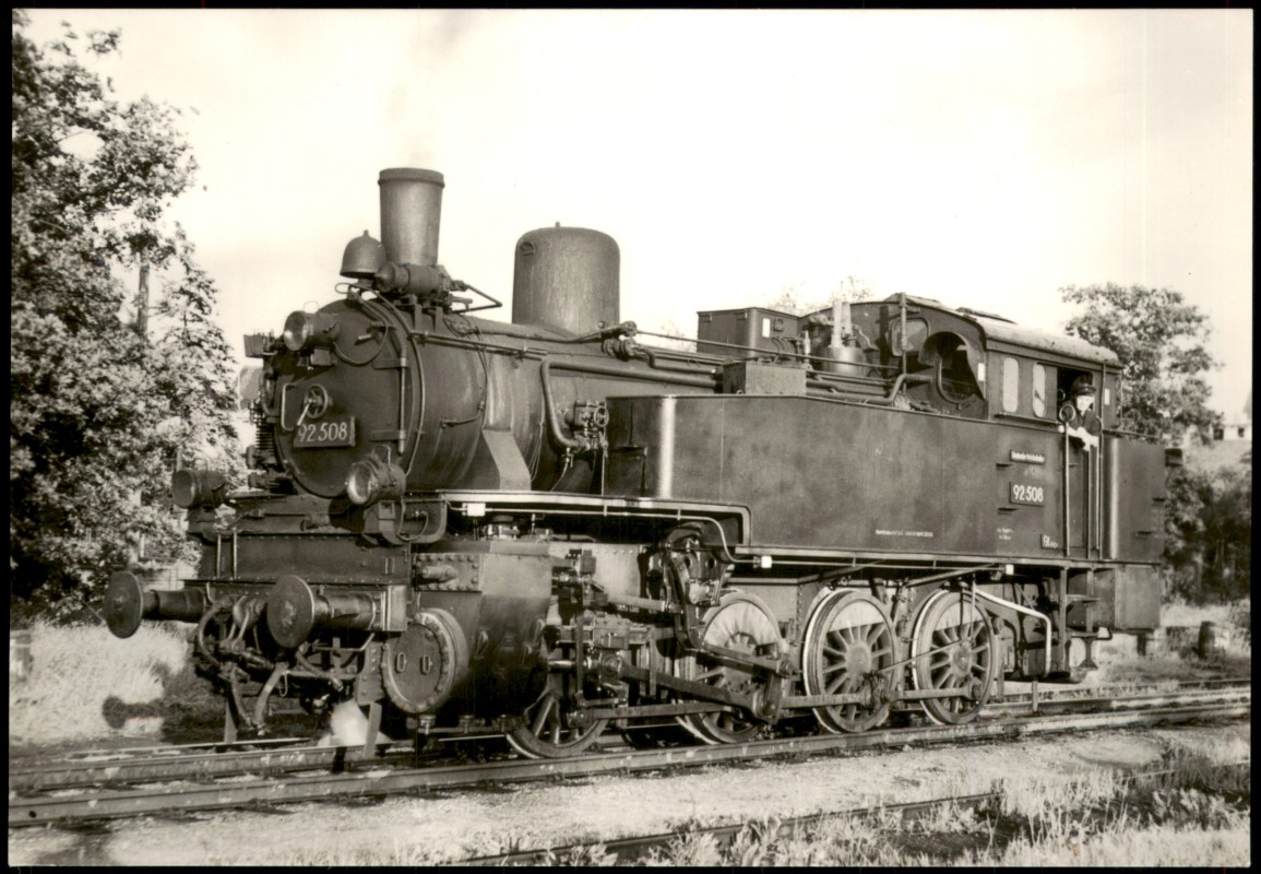 - Historische Ansicht der Dampflokomotive mit der Betriebsnummer 92 508, die zur Baureihe 92.5-10 gehört. Diese Tenderlokomotive der preußischen Staatsbahn (ursprünglich als T 13 bezeichnet) wurde ab 1910 in Dienst gestellt. Sie hatte eine Spurweite von 1435 mm, eine Länge über Puffer von 11.100 mm und eine Höchstgeschwindigkeit von 45 km/h. Die Lokomotiven wurden von verschiedenen Herstellern gebaut, die hier gezeigte hat die Fabriknummer 1808. Die Baureihe T 13 wurde als Ersatz für C-Kuppler entwickelt und zeichnete sich durch ihre robuste und unkomplizierte Ausführung aus, was zu einer Produktion von 562 Maschinen bis 1922 führte. Ein Großteil wurde später von der DR als BR 925-10 übernommen.