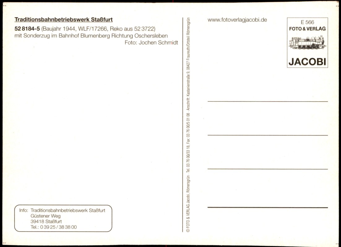 - Eine historische Dampflokomotive der Baureihe 52 8184-5 (Baujahr 1944, WLF/17266, Reko aus 52 3722) zieht einen Sonderzug durch den Bahnhof Blumenberg in Richtung Oschersleben. Die Lokomotive, betrieben vom Traditionsbahnbetriebswerk Staßfurt, stößt eine große Rauchwolke aus. Im Hintergrund ist ein markanter Wasserturm mit der Aufschrift 'Blume' zu sehen. Das Foto wurde von Jochen Schmidt aufgenommen und vom FOTO & VERLAG Jacobi, Römersgrün (Hobby-Foto Jacobi) unter der Seriennummer E 566 herausgegeben. Weitere Informationen zum Traditionsbahnbetriebswerk Staßfurt: Güstener Weg, 39418 Staßfurt, Tel.: 039 25/38 38 00.
