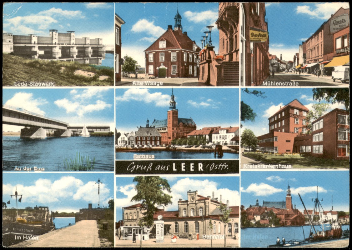 Foto Karte: Mehrbildkarte u.a. mit Leda-Stauwerk Mühlenstraße Kreiskrankenhaus Bahnhof - Leer (Ostfriesland)