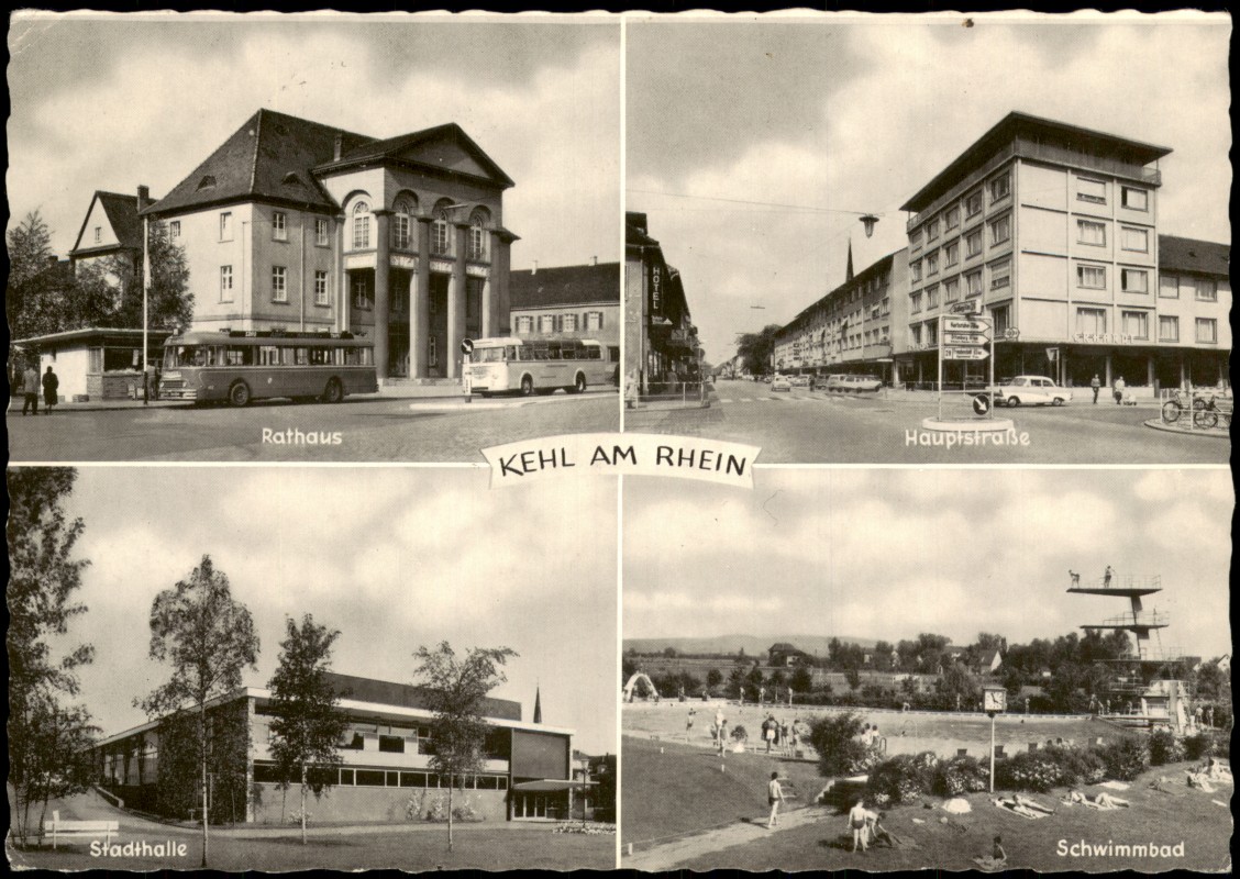 Ansichtskarte: 4 Bild Hauptstraße Bus Kiosk Schwimmbad - Kehl (Rhein)
