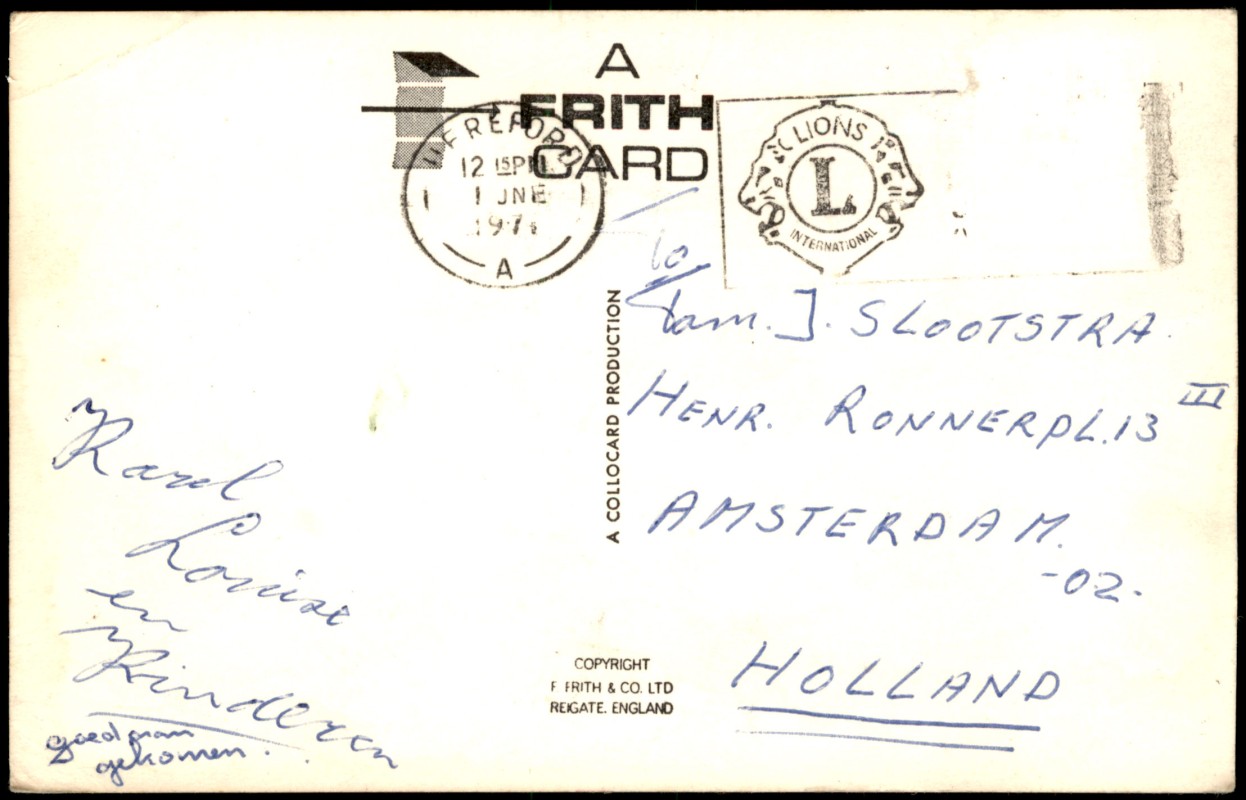 - Farbige Mehrbildpostkarte (Collocard Production) aus Hay-on-Wye, Wales. Die Karte zeigt fünf Einzelmotive: The Castle (Burgruine), The Church (St. Mary's Church), The River Wye, The Bridge (mit Pferden im Vordergrund) und The Market (mit dem markanten Uhrturm und Marktständen). Herausgegeben von F. Frith & Co. Ltd., Reigate.