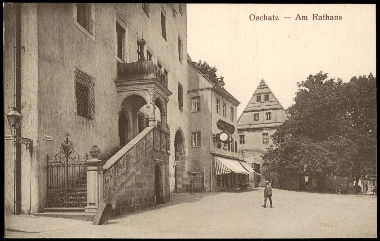 Ansichtskarte: Am Rathaus - Gaststätte Uhr - Oschatz
