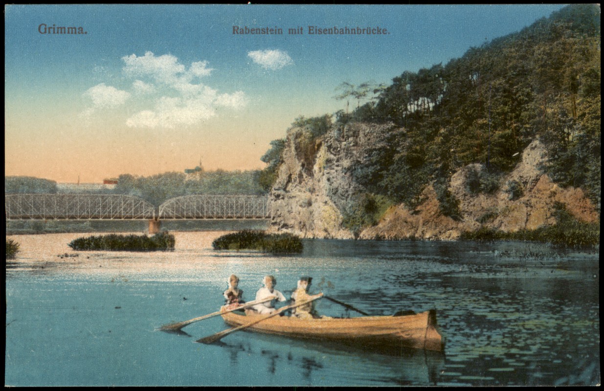 Ansichtskarte: Rabenstein mit Eisenbahnbrücke. Ruderer - Grimma