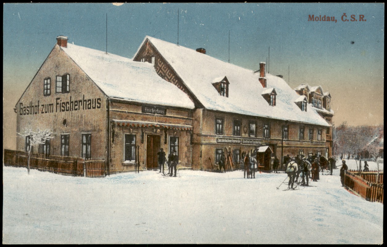 Ansichtskarte: Fischerhaus Skifahrer im Winter - Moldau