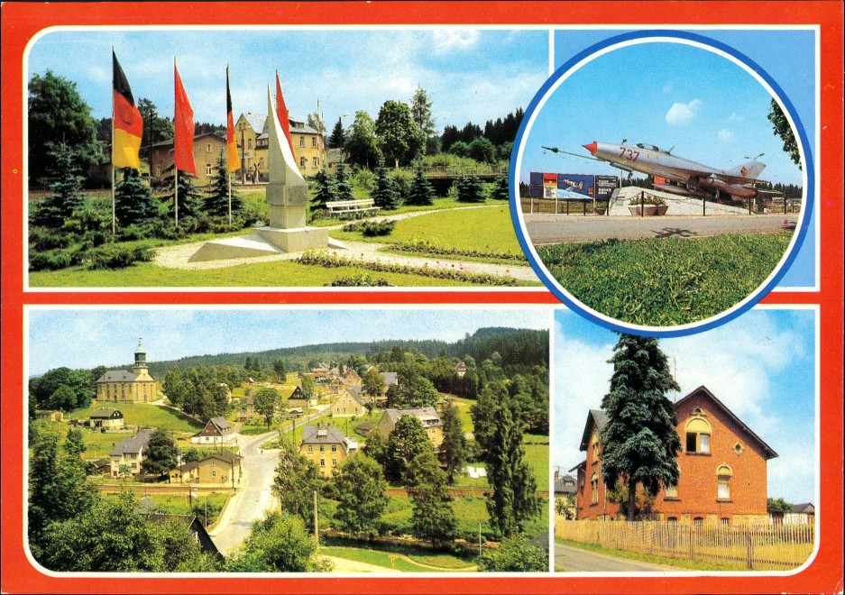 Ansichtskarte: Denkmal Kosmonauten/Weltraumflug, Ständige Ausstellung mit MIG 21, Ortsansicht, Elternhaus von Oberst Sigmund Jähn - Morgenröthe-Rautenkranz