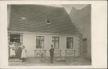 Wohnhaus mit Personengruppe und Fahrrad