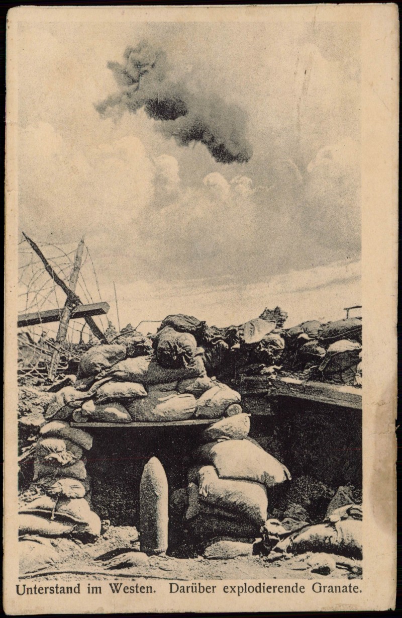 - Militär WK1 Unterstand im Westen. Darüber explodierende Granate.