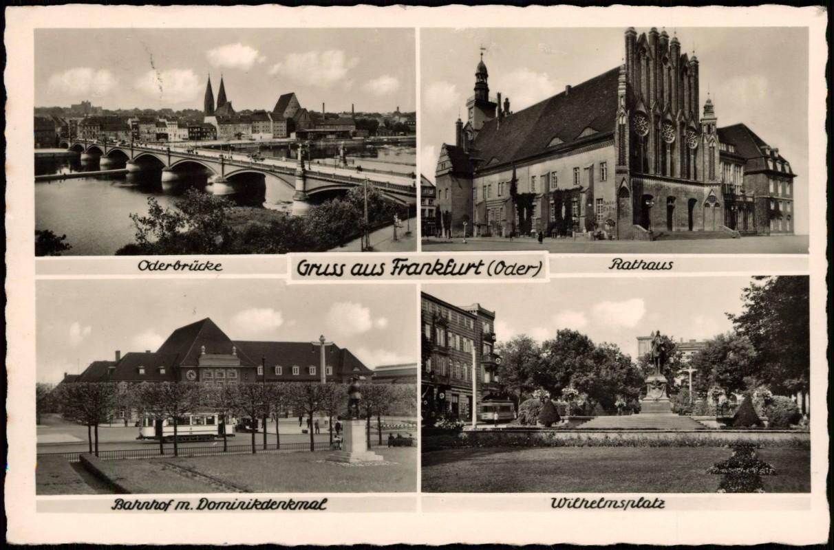 Ansichtskarte: 4 Bild: Oderbrücke, Bahnhof, Wilhelmsplatz - Frankfurt (Oder)