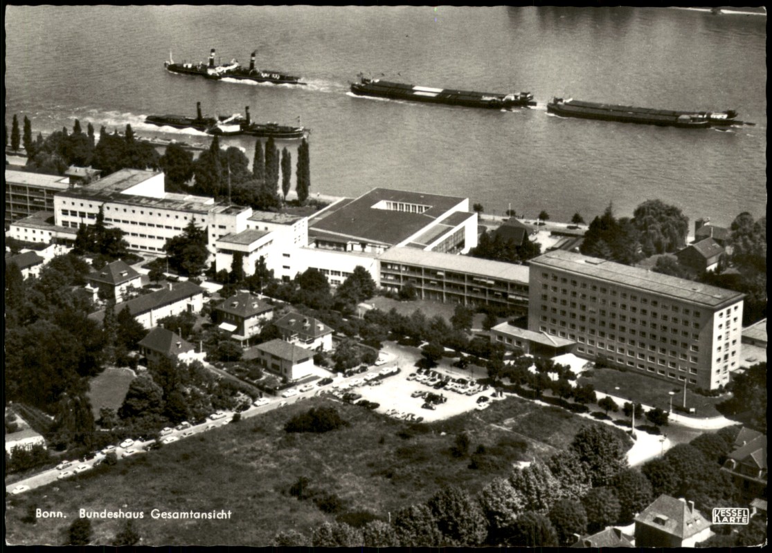 Ansichtskarte: Luftbild Bundeshaus - Rheindampfer - Bonn