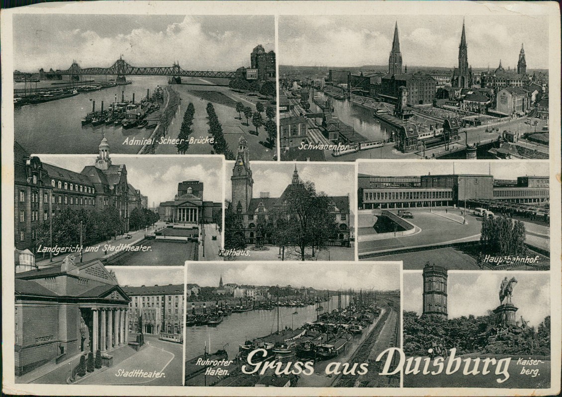 Ansichtskarte: Admiral-Scheer-Brücke. Landgericht Hafen Bahnhof - Duisburg