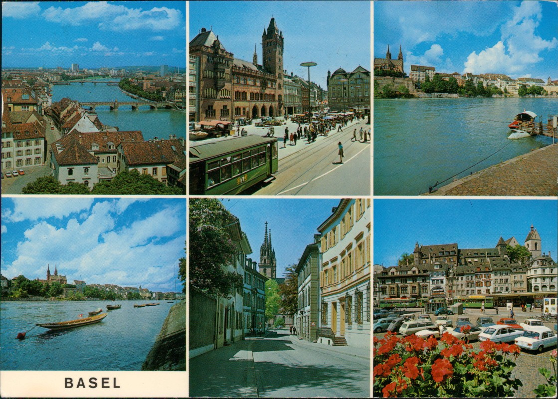 - Farbige Mehrbildkarte mit sechs verschiedenen Ansichten von Basel. Die Motive umfassen: Eine Luftaufnahme der Rheinbrücken, den Marktplatz mit dem markanten roten Rathaus, eine Ansicht des Rheins mit dem Basler Münster, die Rittergasse sowie den Barfüsserplatz. Die Karte trägt den Aufdruck 'GASTLICHES BASEL' und 'KONGRESS-STADT AM RHEIN'. Herausgegeben vom Verlag Beringer & Pampaluchi, Zürich. Printed in Switzerland.