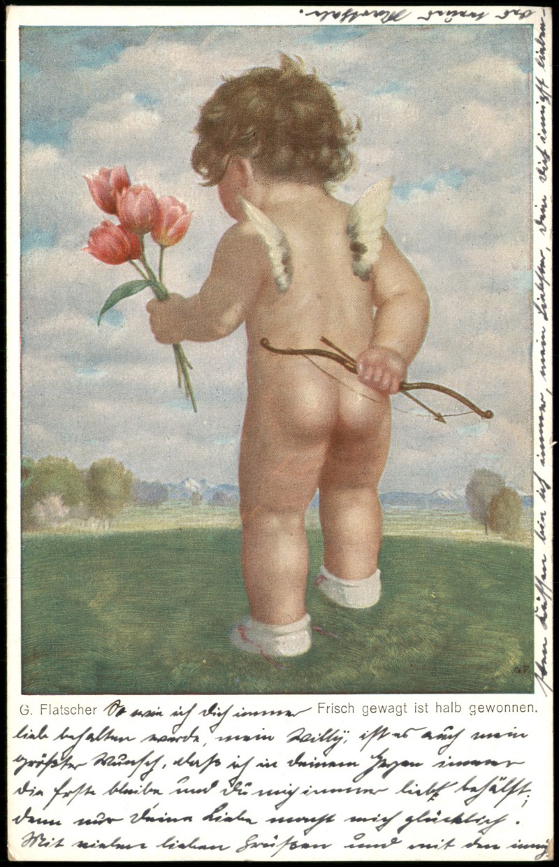 - G. Flatscher Künstlerkarte Kind nackt mit Amor-Pfeilen u. Bogen