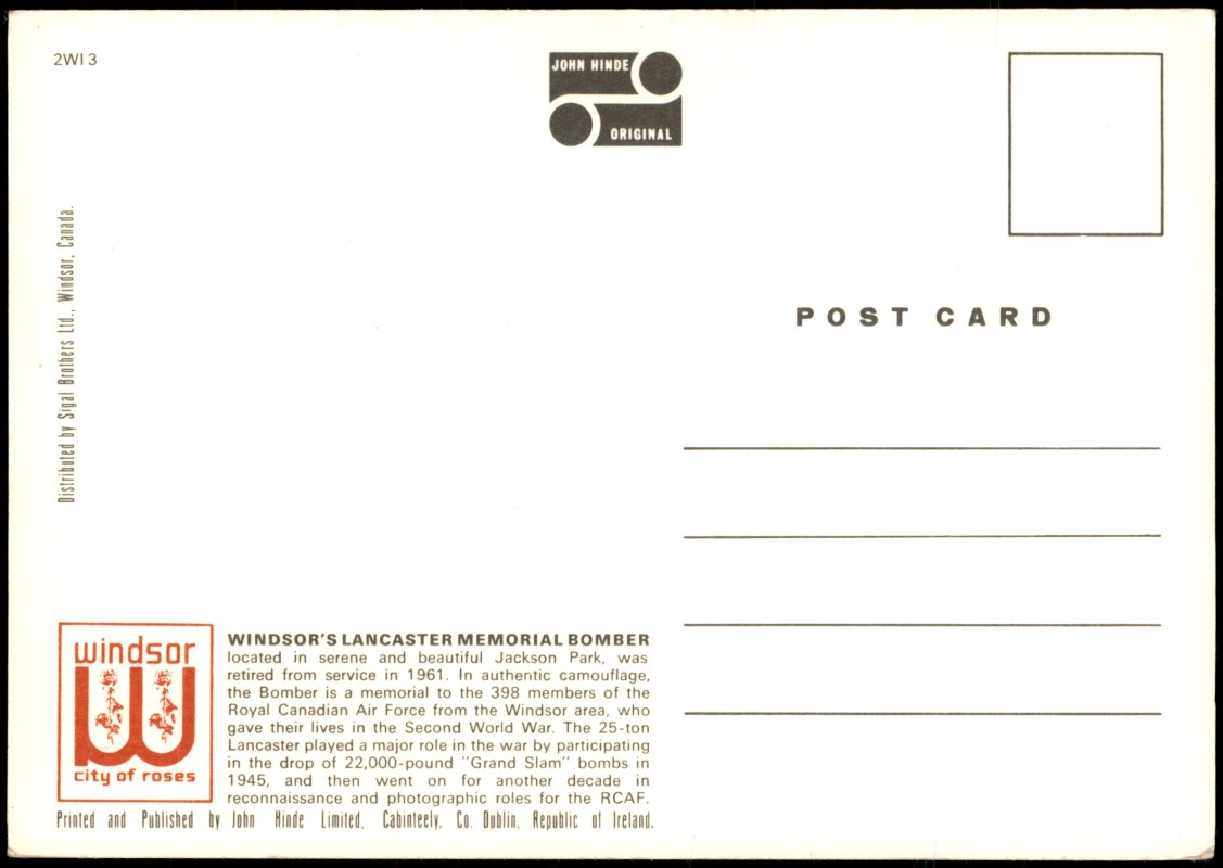 - Farbfotografie des Lancaster Memorial Bombers im Jackson Park, Windsor, Kanada. Das Flugzeug ist in authentischer Tarnbemalung auf einem Betonsockel ausgestellt und dient als Denkmal für 398 gefallene Mitglieder der Royal Canadian Air Force (RCAF) aus Windsor. Der Text auf der Rückseite erläutert die Geschichte des 25 Tonnen schweren Bombers, der 1945 am Abwurf von 'Grand Slam'-Bomben beteiligt war und bis 1961 für Aufklärungszwecke genutzt wurde. Foto von E. Ludwig, John Hinde Studios. Herausgegeben von John Hinde Limited, Dublin; Vertrieb durch Sigal Brothers Ltd., Windsor.