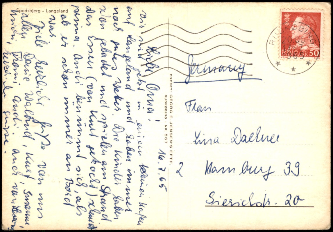 - Farbansichtskarte des Hafens von Spodsbjerg auf der dänischen Insel Langeland. Im Vordergrund liegen mehrere Ruderboote am Ufer, während im Hafenbecken Segelschiffe und ein größeres Fähr- oder Motorschiff zu sehen sind. Die Karte wurde vom Verlag Georg E. Jensen's Eftf. in Rudkøbing herausgegeben.