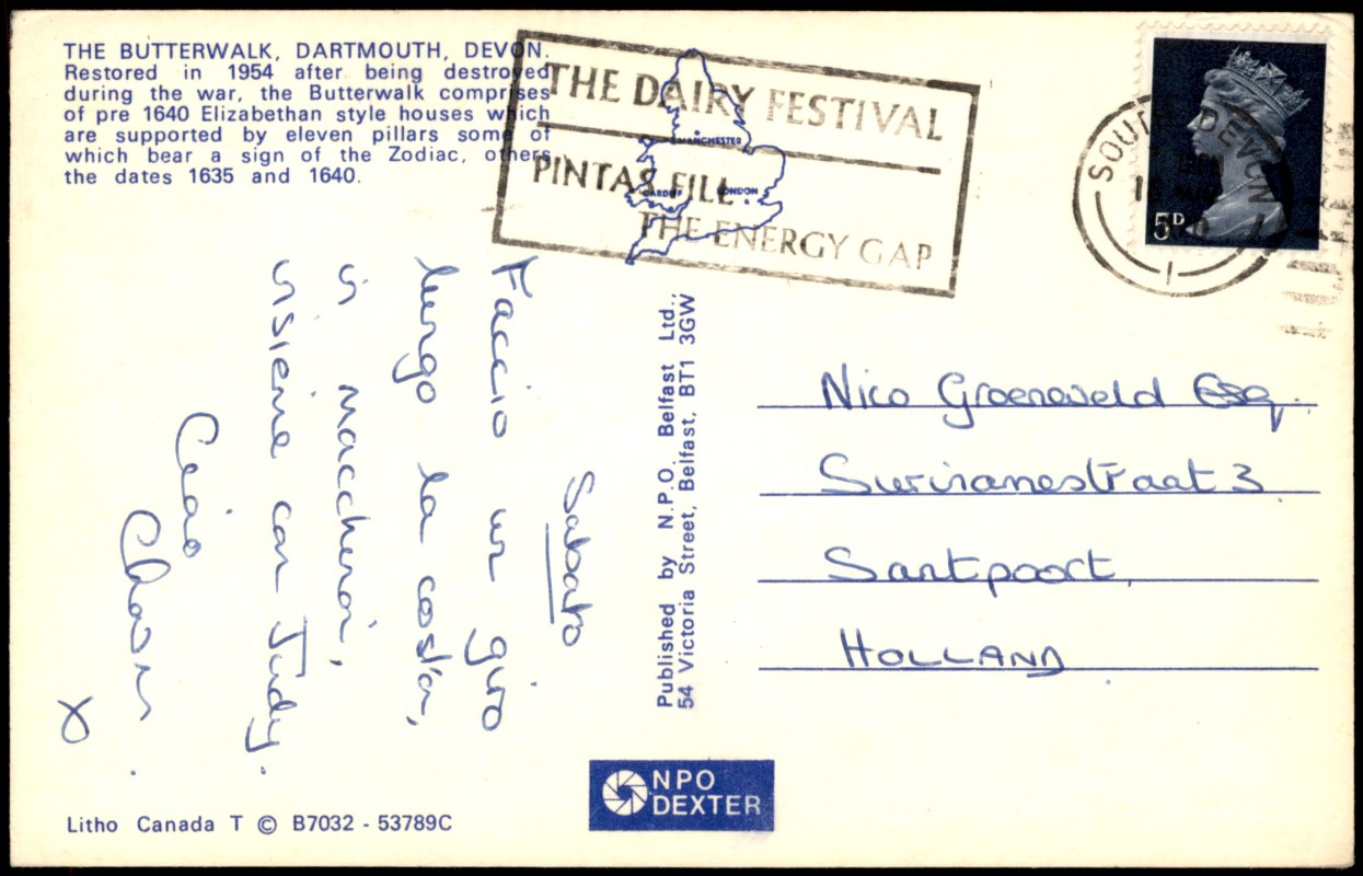- Historische Ansicht der 'Butterwalk' in Dartmouth, Devon. Die Karte zeigt die elisabethanischen Fachwerkhäuser (vor 1640), die auf elf markanten Säulen ruhen. Der gedruckte Text beschreibt die Restaurierung im Jahr 1954 nach Kriegsschäden sowie Details zu den Säulen, die teilweise Tierkreiszeichen oder die Jahreszahlen 1635 und 1640 tragen. Herausgegeben von N.P.O. Belfast Ltd., hergestellt von NPO DEXTER (Litho Canada).