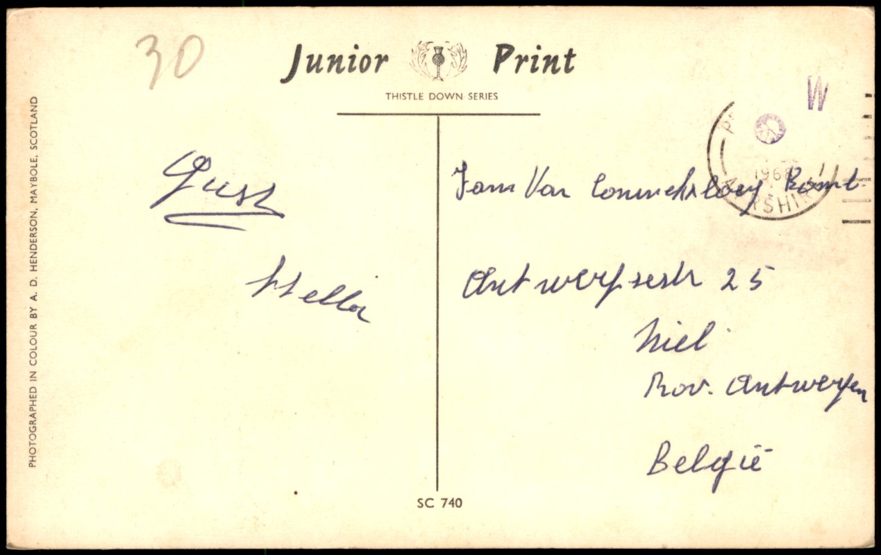 - Farbfotografie des Strandes von Prestwick, Schottland. Die Aufnahme zeigt einen weiten Blick über den belebten Sandstrand mit zahlreichen Badegästen und Liegestühlen. Im Hintergrund ist die Uferpromenade mit parkenden Autos und einer Reihe von Wohnhäusern zu sehen. Die Karte gehört zur 'Thistle Down Series' und wurde von A. D. Henderson fotografiert.