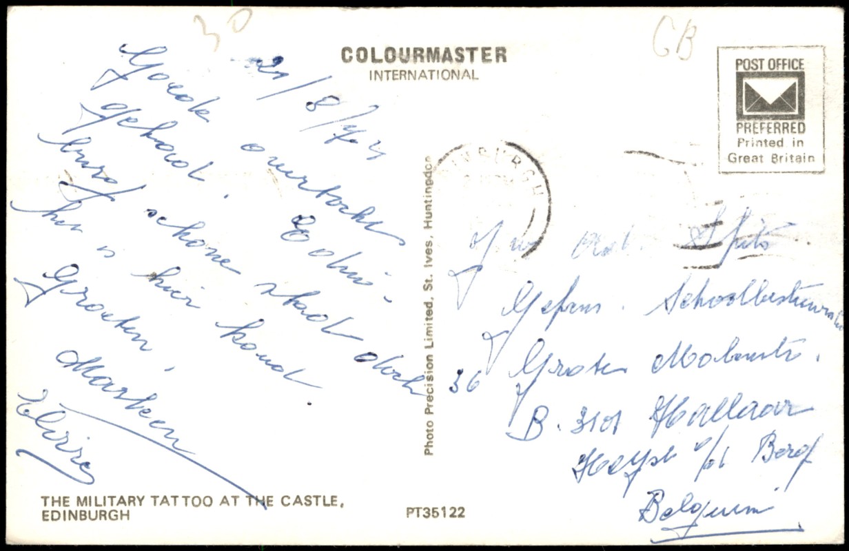 - Farbfotografie der nächtlichen Militärparade 'The Military Tattoo' auf der Esplanade vor dem beleuchteten Edinburgh Castle. Zu sehen sind marschierende Militärkapellen in Formation sowie die Zuschauertribünen. Herausgegeben von Photo Precision Limited unter der Marke Colourmaster International. Gedruckt in Großbritannien.