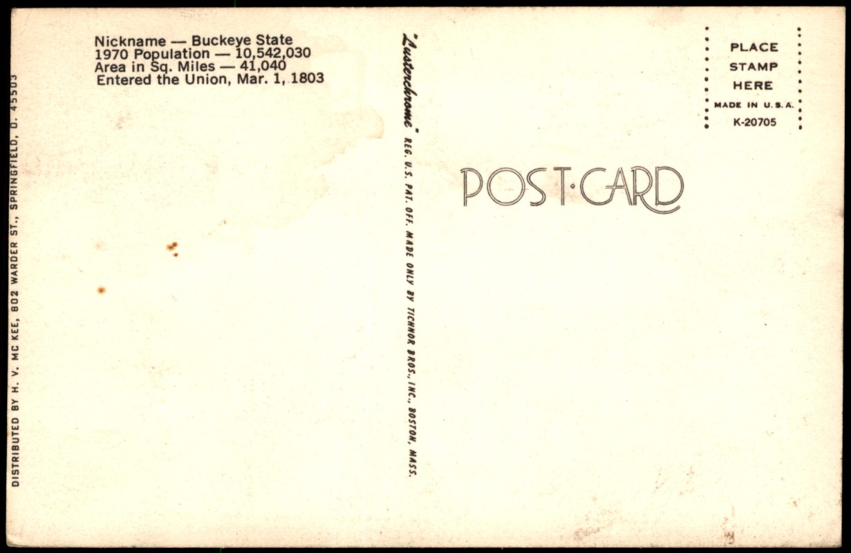 - Farbenfrohe 'Large Letter'-Ansichtskarte des Bundesstaates Ohio. Die Buchstaben des Wortes 'OHIO' enthalten verschiedene Ansichten, darunter eine Brücke, eine Skyline und ein Stadion. Auf der Vorderseite sind zudem die Staatsblume (Scarlet Carnation) und das State Capitol in Columbus abgebildet. Die Rückseite enthält statistische Informationen zum Bundesstaat (Nickname, Bevölkerung 1970, Fläche, Beitritt zur Union). Hergestellt von Tichnor Bros., Inc. (Lusterchrome) und vertrieben durch H. V. McKee aus Springfield, Ohio.