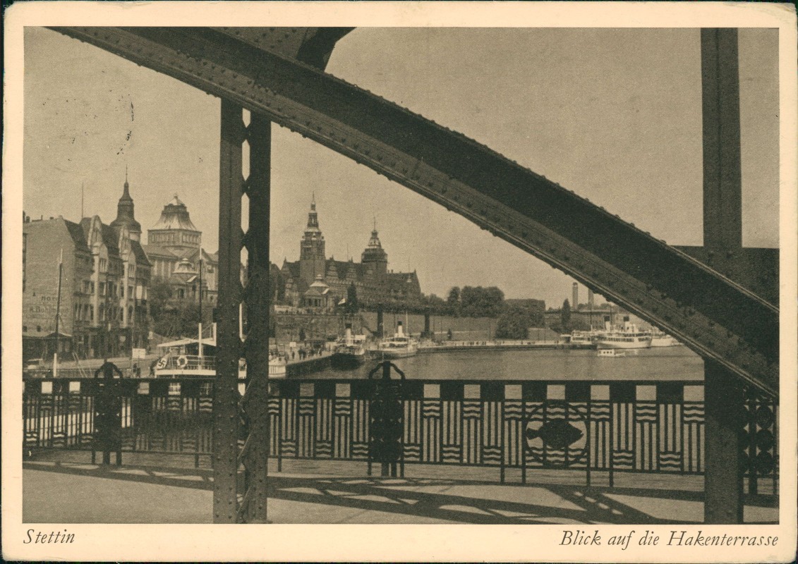 Ansichtskarte: Blick auf die Hakenterrasse von der Brücke - Dampfer - Stettin