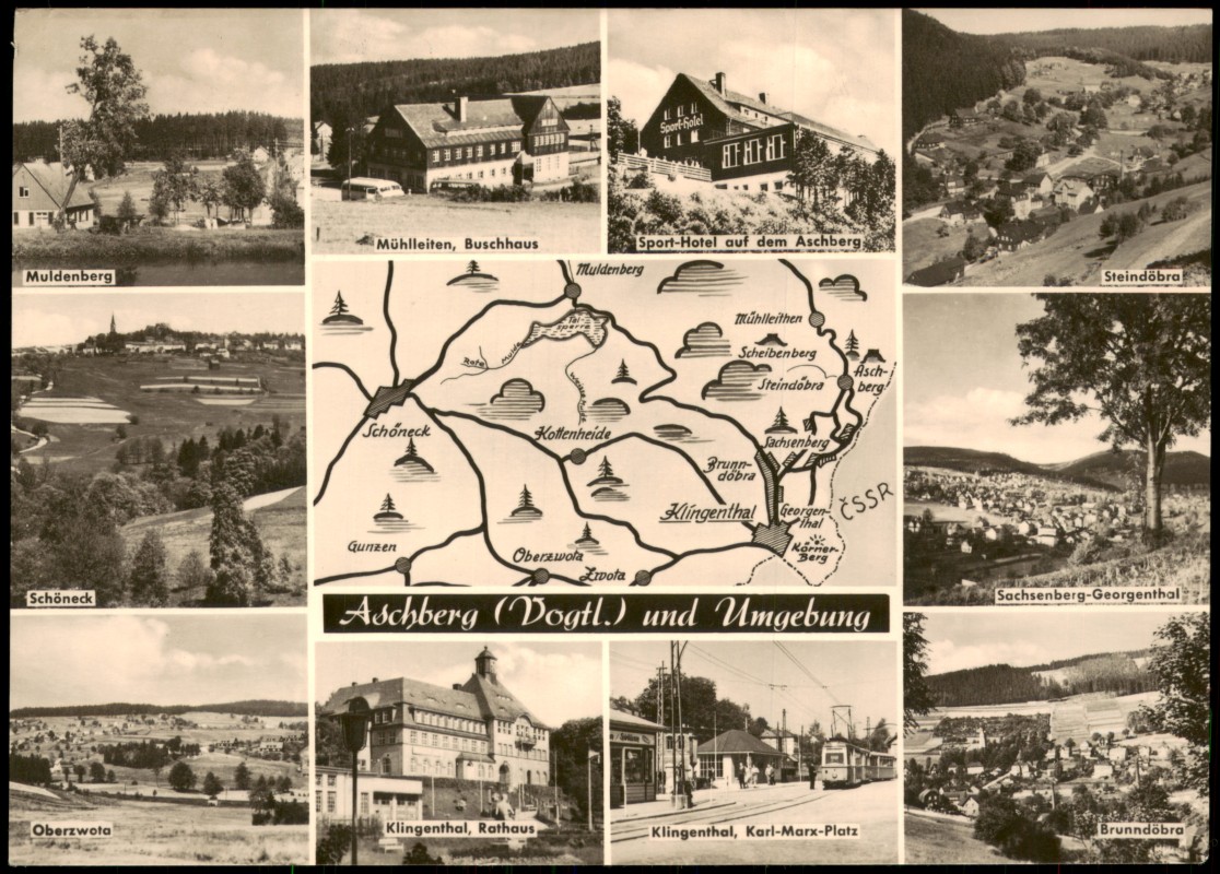 - DDR Mehrbild-AK Aschberg Vogtland Landkarte und Orte