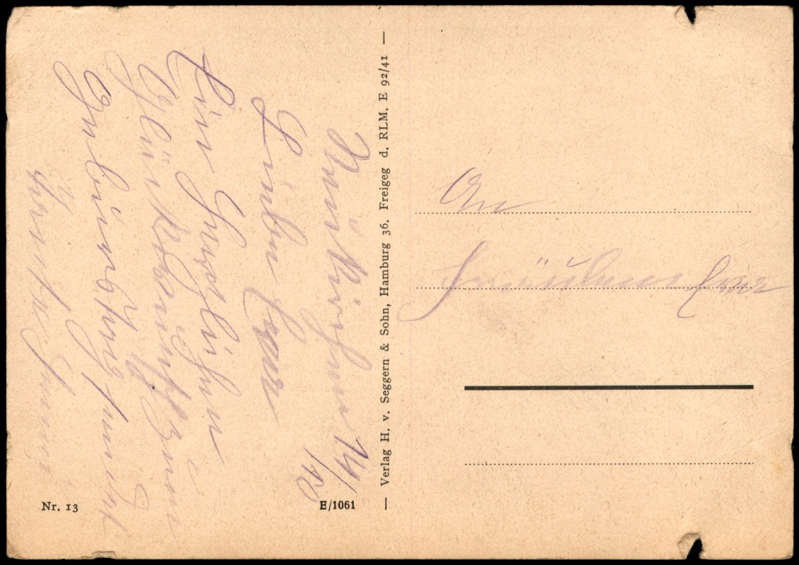 - Schwarz-Weiß-Fotografie des Bismarck-Denkmals in Hamburg, aufgenommen aus einer Perspektive unterhalb des Denkmalsockels. Am Fuße des Denkmals und auf den Wegen sind kleine Personengruppen erkennbar. Die Karte trägt die Signatur 'H. v. Seggern' des Fotografen/Künstlers. Rückseitig findet sich der Vermerk 'Freigeg d. RLM. E 92/41', was auf eine Produktion während des Zweiten Weltkriegs hindeutet.