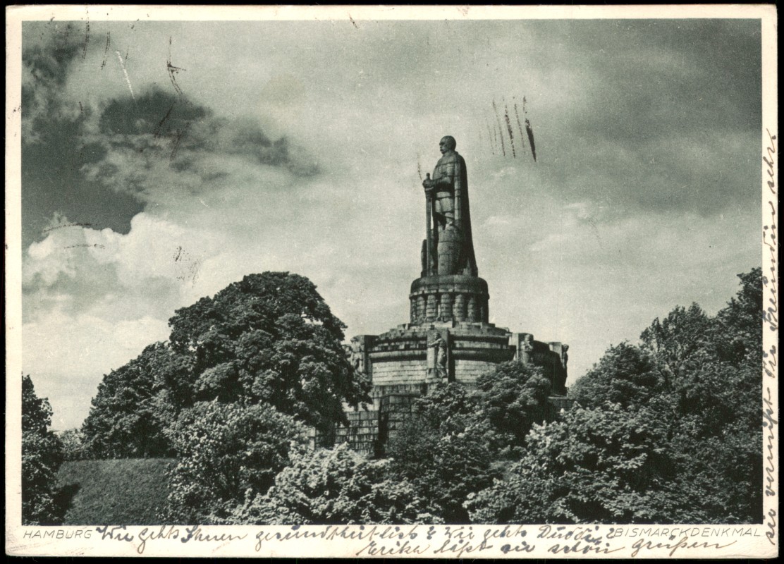 - Fotografische Ansicht des Bismarck-Denkmals in Hamburg. Die monumentale Statue des Reichskanzlers Otto von Bismarck steht auf einem hohen, runden Steinsockel, der mit Reliefs verziert ist. Das Denkmal ist von dichten Baumkronen einer Parkanlage umgeben. Am unteren Bildrand befindet sich die gedruckte Beschriftung 'HAMBURG BISMARCKDENKMAL'.