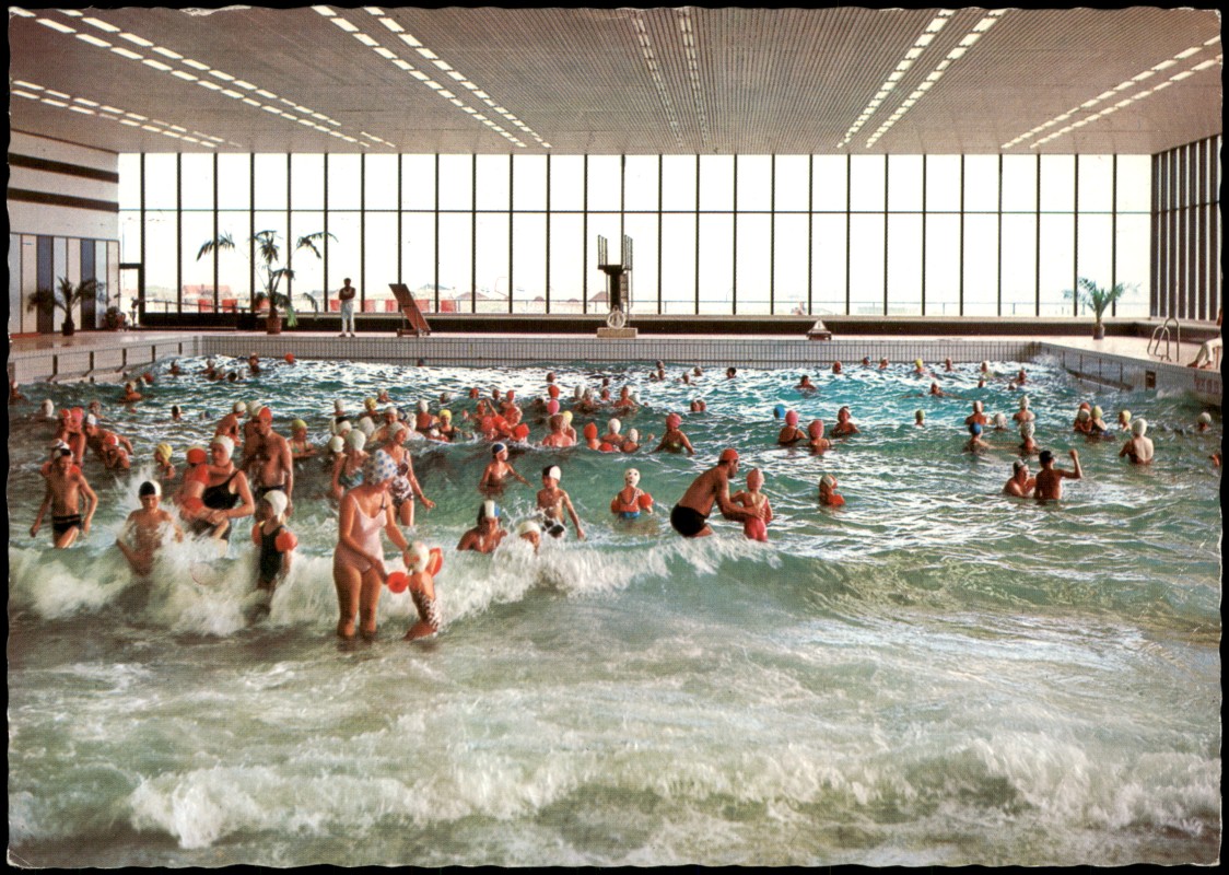 - Farbfotografie des Innenbereichs des Meerwasser-Wellenschwimmbads im Nordseeheilbad Borkum. Zu sehen ist das belebte Becken während des Wellenbetriebs mit zahlreichen Badegästen. Im Hintergrund befindet sich eine große Fensterfront. Die Karte enthält gedruckte technische Details: Beckengröße 25 x 50 m, Wassertemperatur 23-27°C und eine Wellenhöhe von bis zu 180 cm.