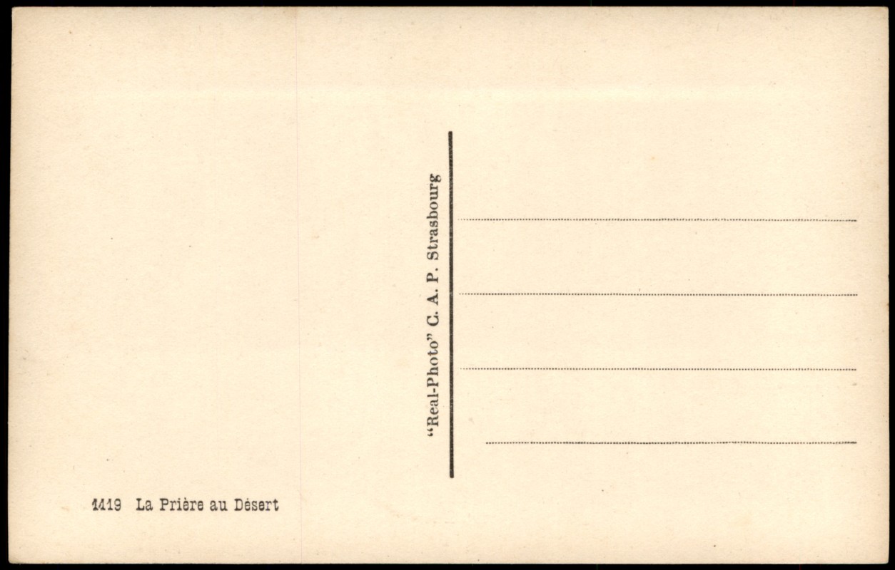 - Echte Fotografie (Real-Photo) einer Szene in der Wüste. Dargestellt ist eine Person in traditioneller Kleidung, die im Sand kniend das Gebet verrichtet. Daneben steht ein gesatteltes Dromedar, das an einer Leine gehalten wird. Im Hintergrund sind weitläufige Sanddünen sichtbar. Die Karte trägt den französischen Titel 'La Prière au Désert'.