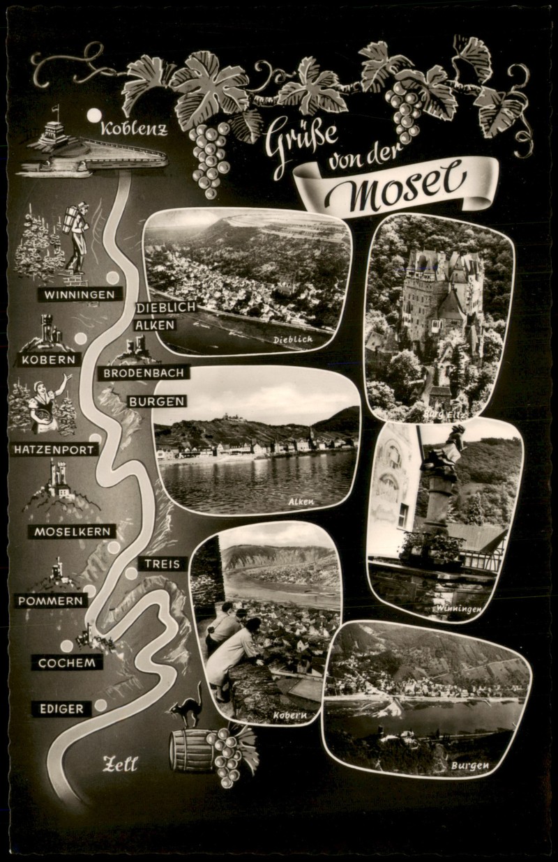 - Echtfoto-Postkarte mit einer illustrierten Karte des Moselverlaufs von Koblenz bis Zell. Die Karte enthält sechs fotografische Ansichten: Panorama von Dieblich, Burg Eltz, Panorama von Alken, der Weinbrunnen in Winningen, eine Ansicht von Kobern mit Personen im Vordergrund und ein Panorama von Burgen. Am oberen Rand ist die Karte mit Weinlaub und dem Schriftzug 'Grüße von der Mosel' dekoriert. Die Rückseite weist das Logo 'Echte Photographie' auf.