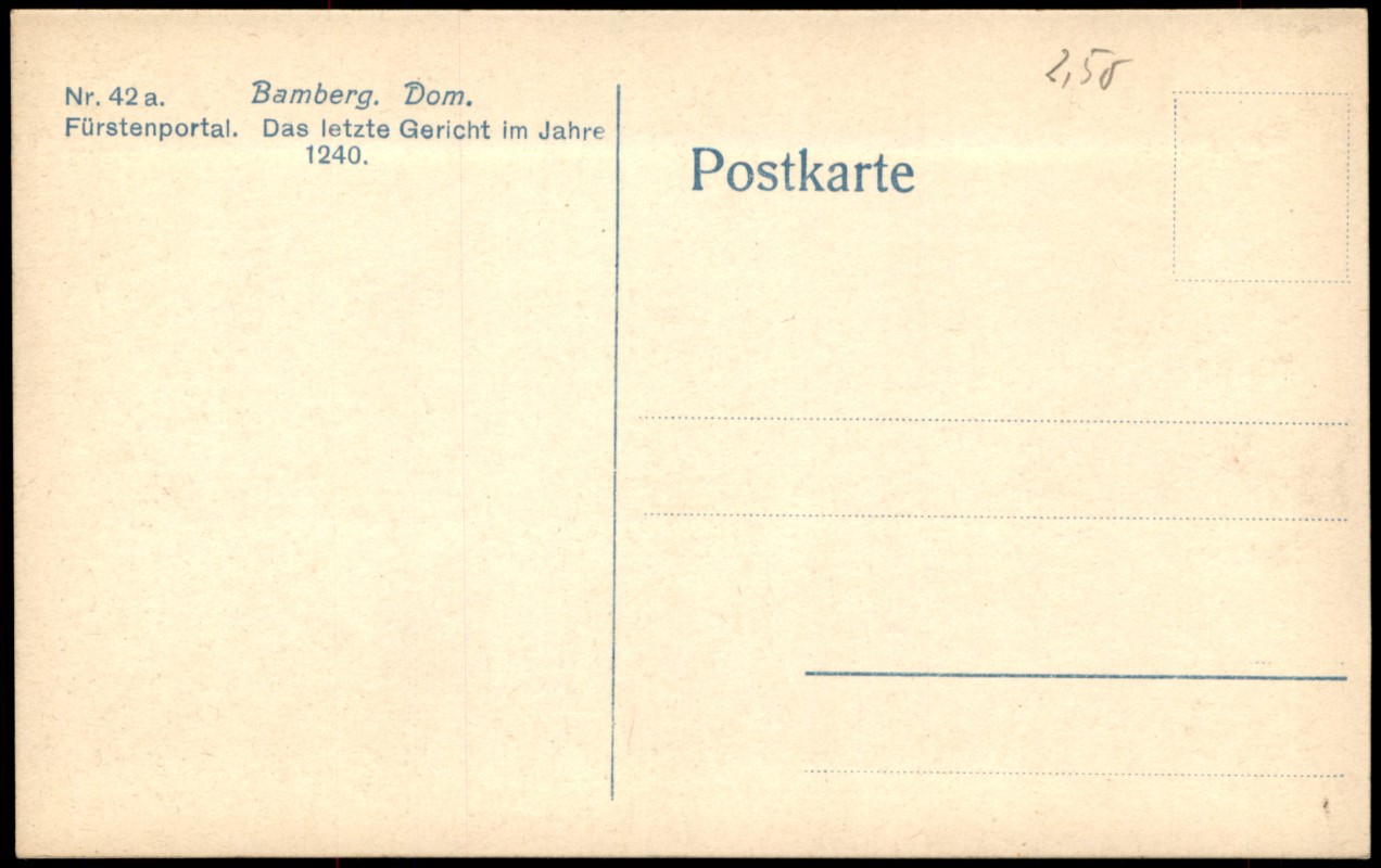 - Detailaufnahme des Tympanons am Fürstenportal des Bamberger Doms. Die Darstellung zeigt das 'Jüngste Gericht' (Das letzte Gericht) aus der Zeit um 1240. Zu sehen ist Christus als Weltenrichter, umgeben von Aposteln, Engeln sowie den Seligen und den Verdammten. Die Karte wurde 1922 im Verlag Wilhelm Krömer, Bamberg, veröffentlicht.