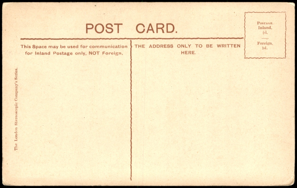 - Reproduktion des Wandgemäldes 'Moses, with Tables of Law' (Moses mit den Gesetzestafeln) des Künstlers John Rogers Herbert. Das Kunstwerk befindet sich im House of Lords (Palace of Westminster) in London. Die Karte ist Teil der Serie der London Stereoscopic Company. Auf der Vorderseite befinden sich Hinweise zur postalischen Nutzung (Inland vs. Foreign Postage).
