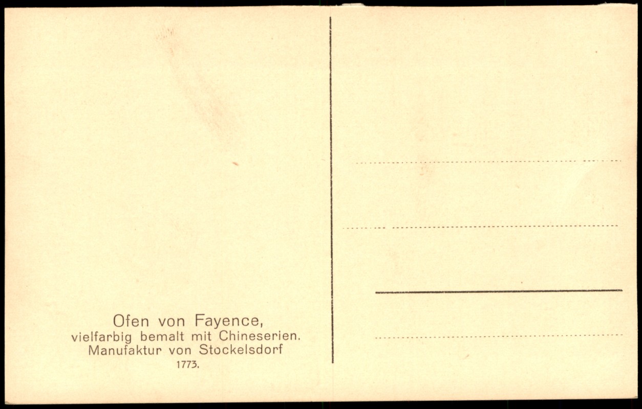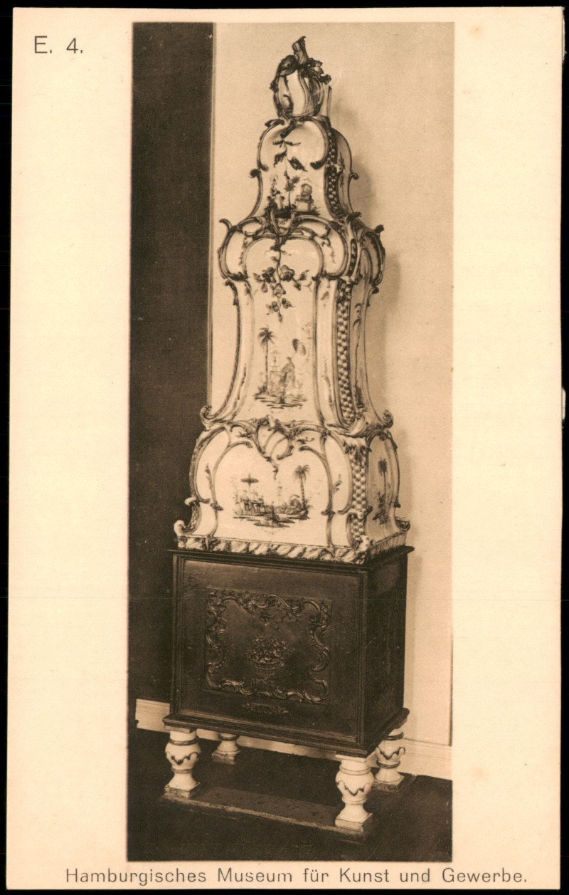 - Die Postkarte zeigt eine Schwarz-Weiß-Fotografie eines prunkvollen Fayence-Ofens aus der Manufaktur von Stockelsdorf (1773). Das Objekt ist vielfarbig mit Chinoiserien (chinesischen Motiven) bemalt. Es handelt sich um ein Exponat aus dem Hamburgischen Museum für Kunst und Gewerbe.