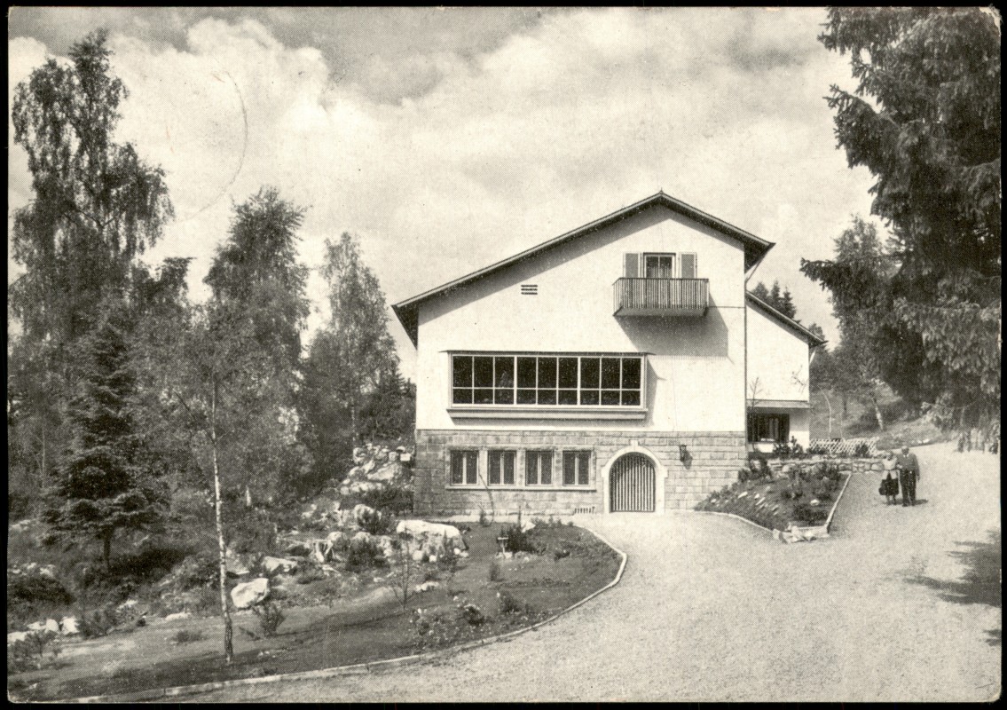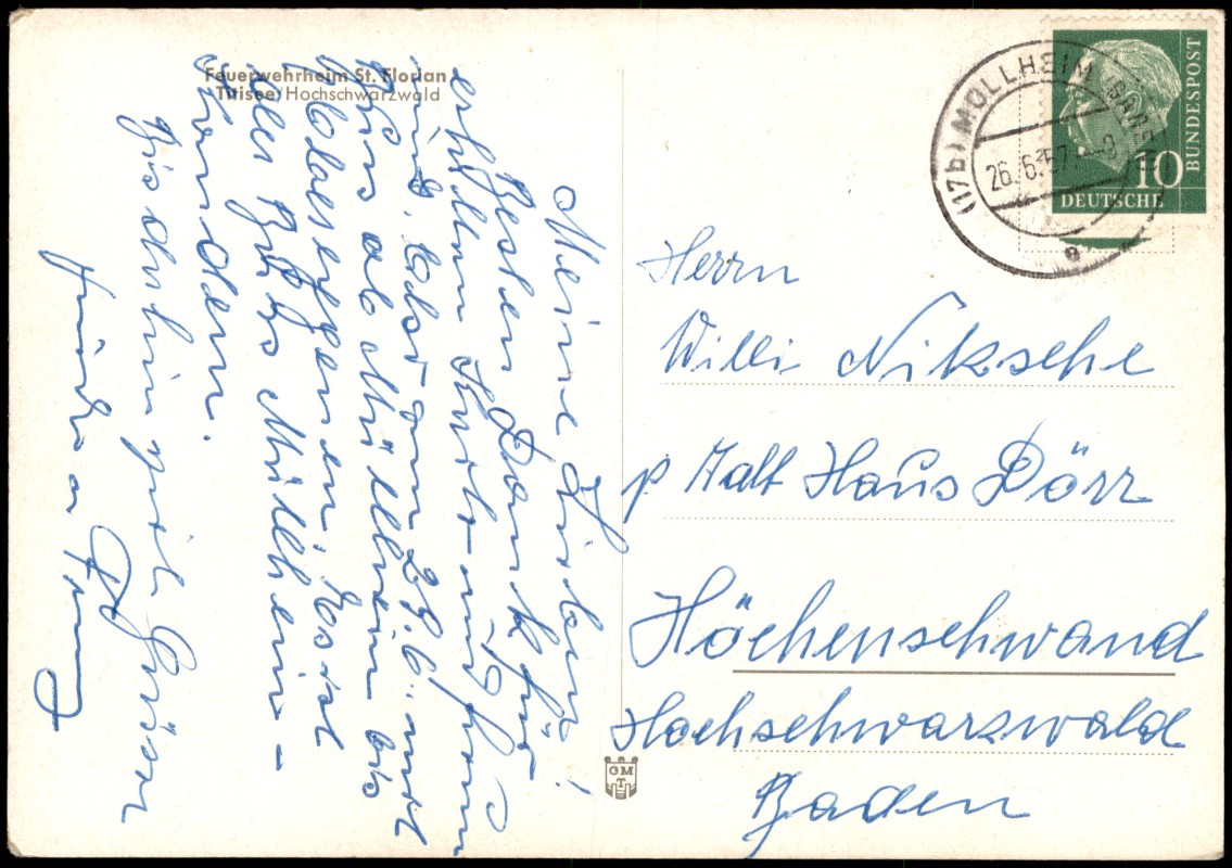 - Die Ansichtskarte zeigt das Feuerwehrheim St. Florian in Titisee (Hochschwarzwald). Das Gebäude ist in einer Hanglage dargestellt und präsentiert sich mit einer charakteristischen Architektur der Nachkriegszeit, inklusive einer großen Fensterfront im ersten Stock, einem Balkon und einem Erdgeschoss mit Natursteinmauerwerk. Eine gepflasterte Auffahrt führt zum Gebäude.