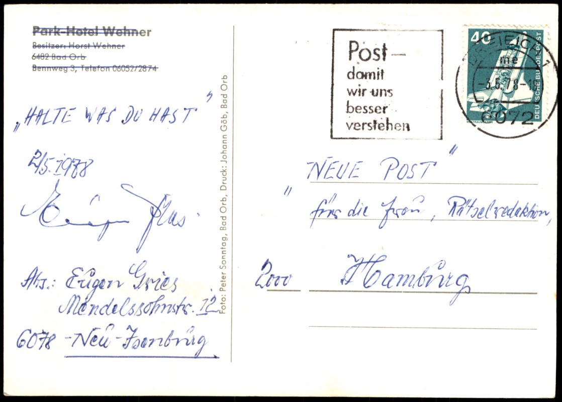 - Mehrbild-AK 2 Innenansichten Park Hotel Wehner Brennweg