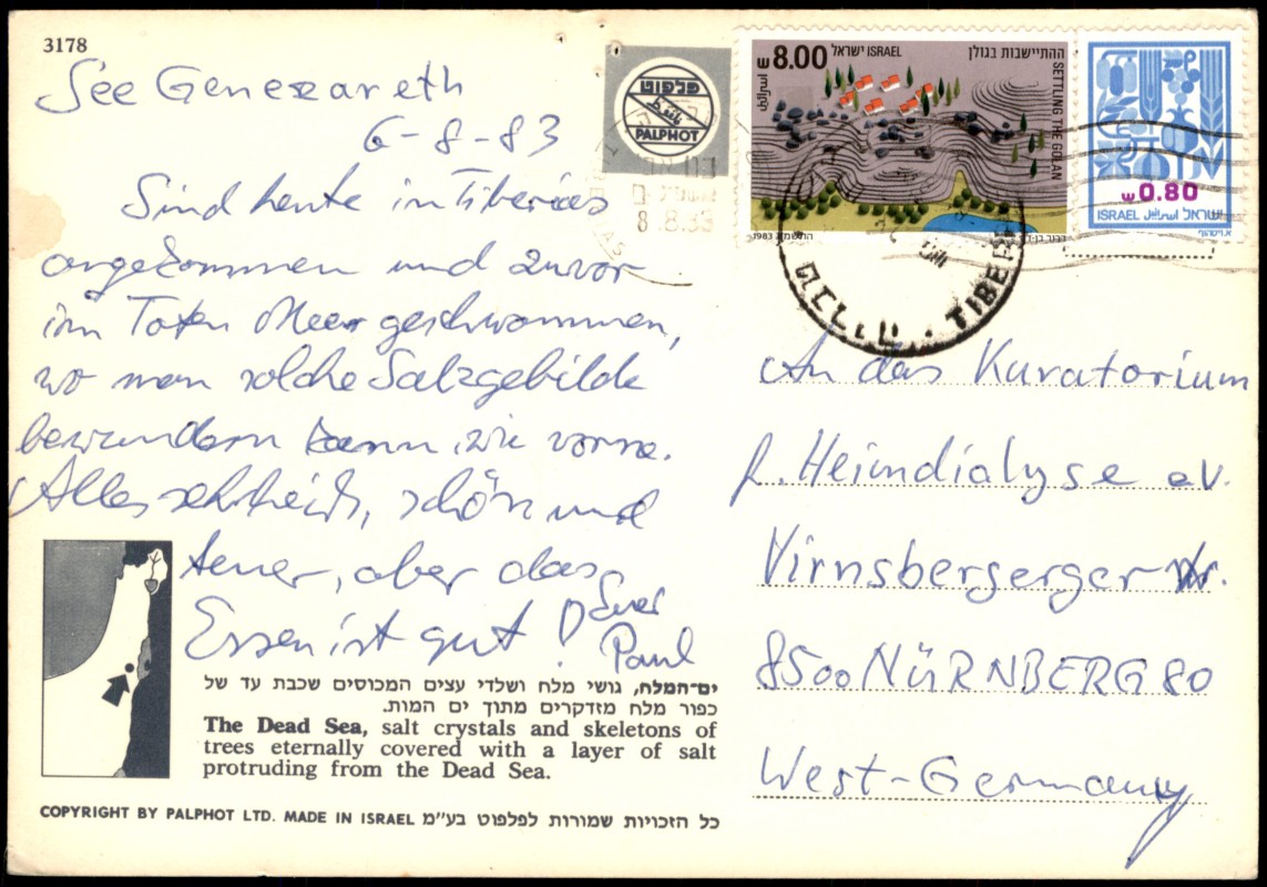 - Farbfotografie des Toten Meeres (The Dead Sea). Das Motiv zeigt im Vordergrund und Mittelgrund bizarre Salzkristallbildungen sowie aus dem Wasser ragende Baumstümpfe und Skelette, die von einer dicken, ewigen Salzschicht überzogen sind. Die Rückseite enthält eine entsprechende Beschreibung des Naturphänomens in Englisch und Hebräisch.