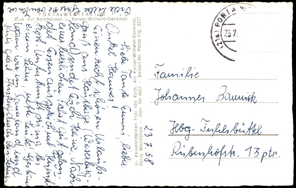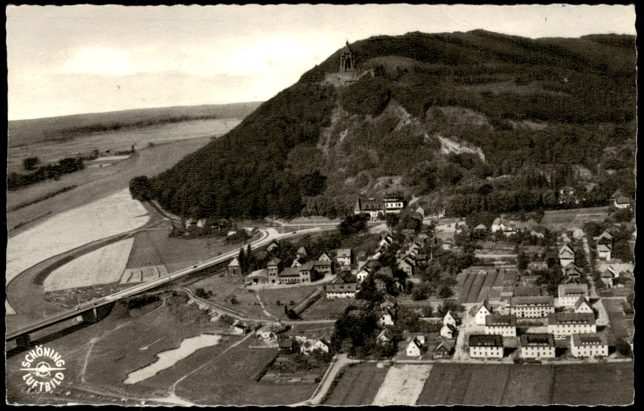- Echte Luftaufnahme (Schöning-Luftbild) von Porta Westfalica. Die Ansicht zeigt den Ortsteil Barkhausen im Vordergrund und das markante Kaiser-Wilhelm-Denkmal auf dem Wittekindsberg im Hintergrund. Rückseitig ist der Titel 'Blick auf Barkhausen u. Kaiser-Wilhelm-Denkmal' sowie der Verlag 'Reiseandenken Frau Ida Koch' aufgedruckt. Die Karte trägt zudem die Genehmigungsnummer SH 4653.