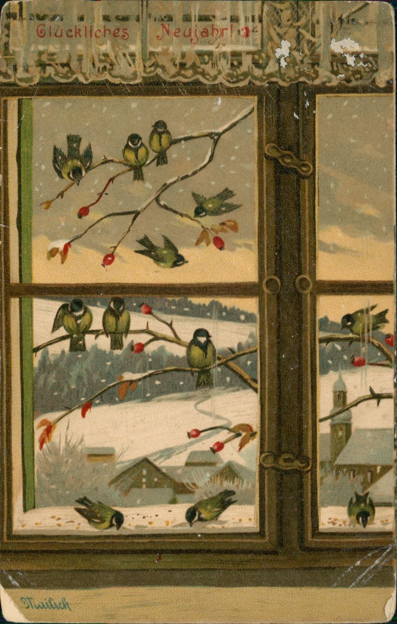 - Neujahr Sylvester New Year Vögel am Fenster Künstlerkarte Mailick