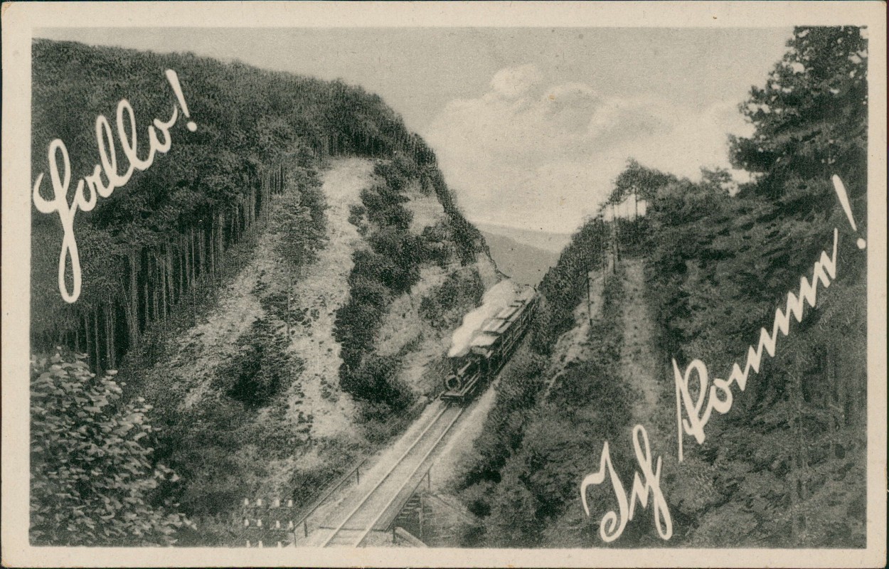 Ansichtskarte: Ich komme! Dampflokomotive im Tal