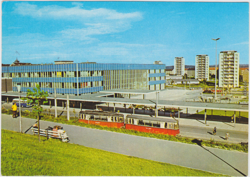 Foto Karte: Partie am oberen Bahnhof, Straßenbahn und Punkthäuser - Plauen (Vogtland)