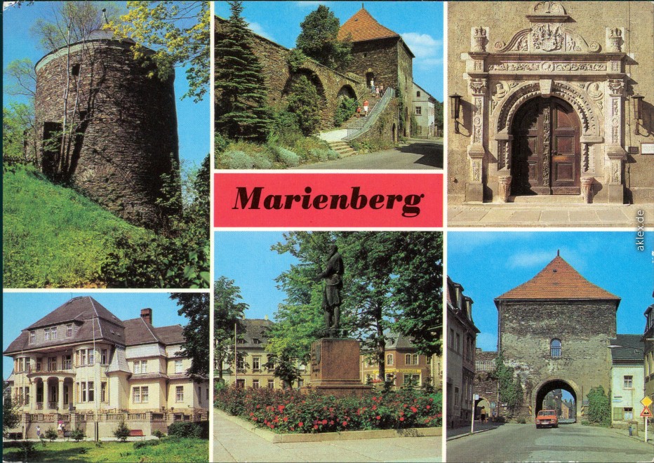 Ansichtskarte: Roter Turm, Heimatmuseum, Renaissanceportal des Rathauses, Pionierhaus, Denkmal, Zschopauer Tor - Marienberg im Erzgebirge
