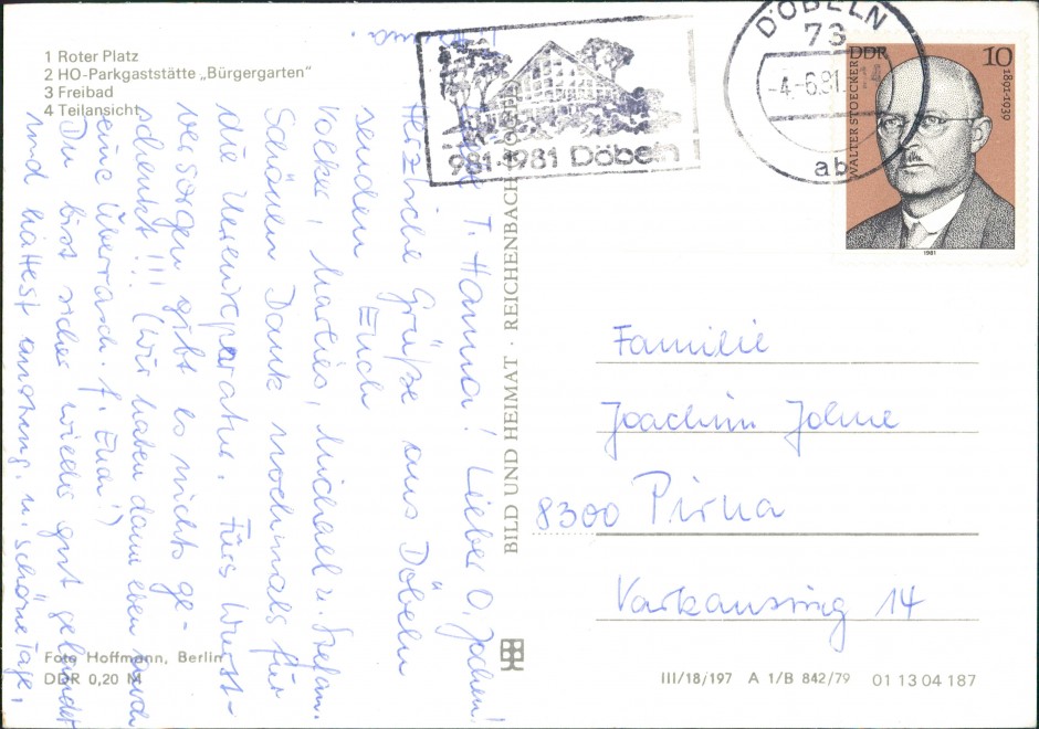 Ansichtskarte: Roter Platz, HO Gaststätte, Freibad - Döbeln