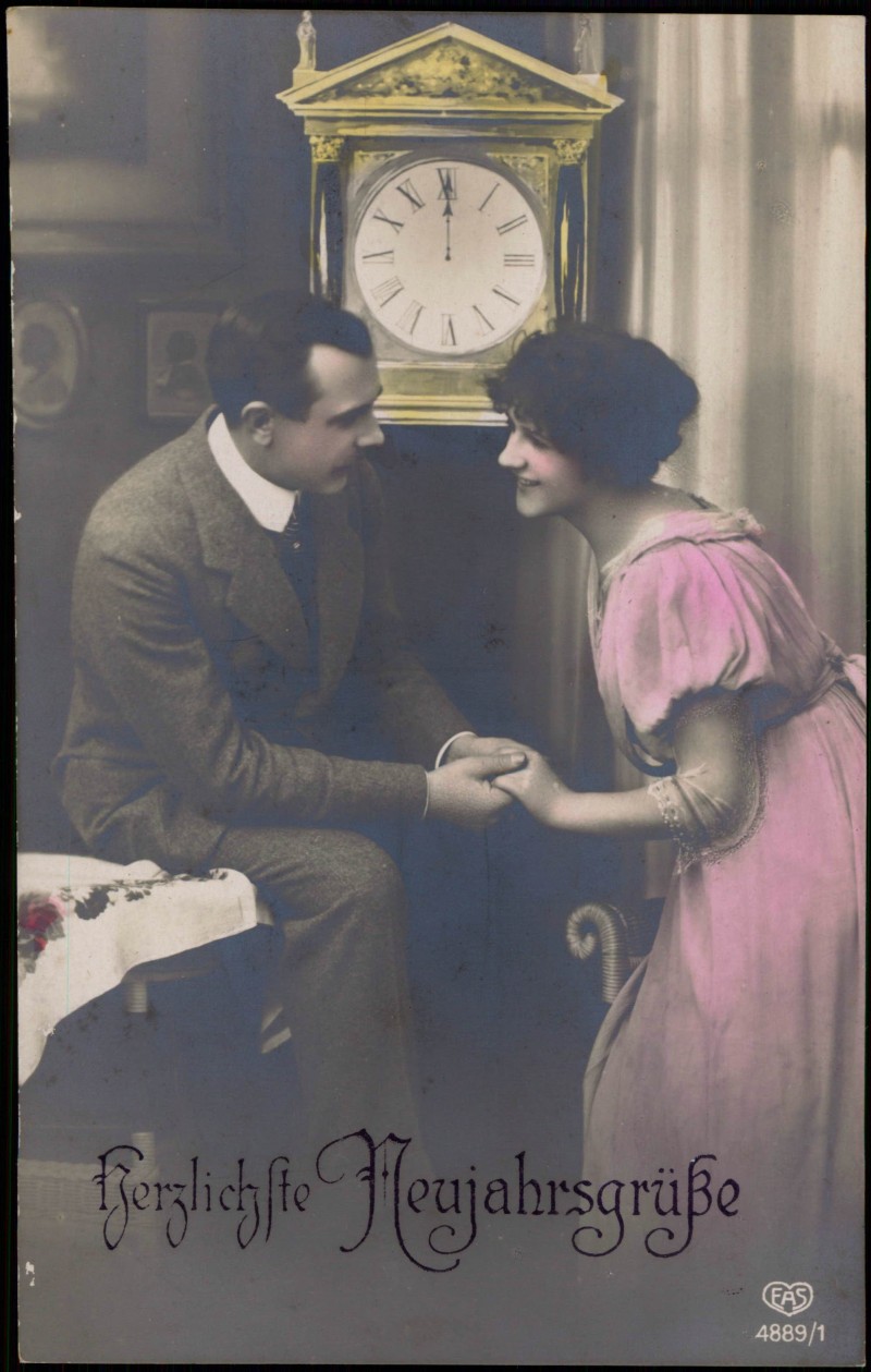 Ansichtskarte: Liebende vor der Standuhr Fotokunst Neujahr Sylvester New Year